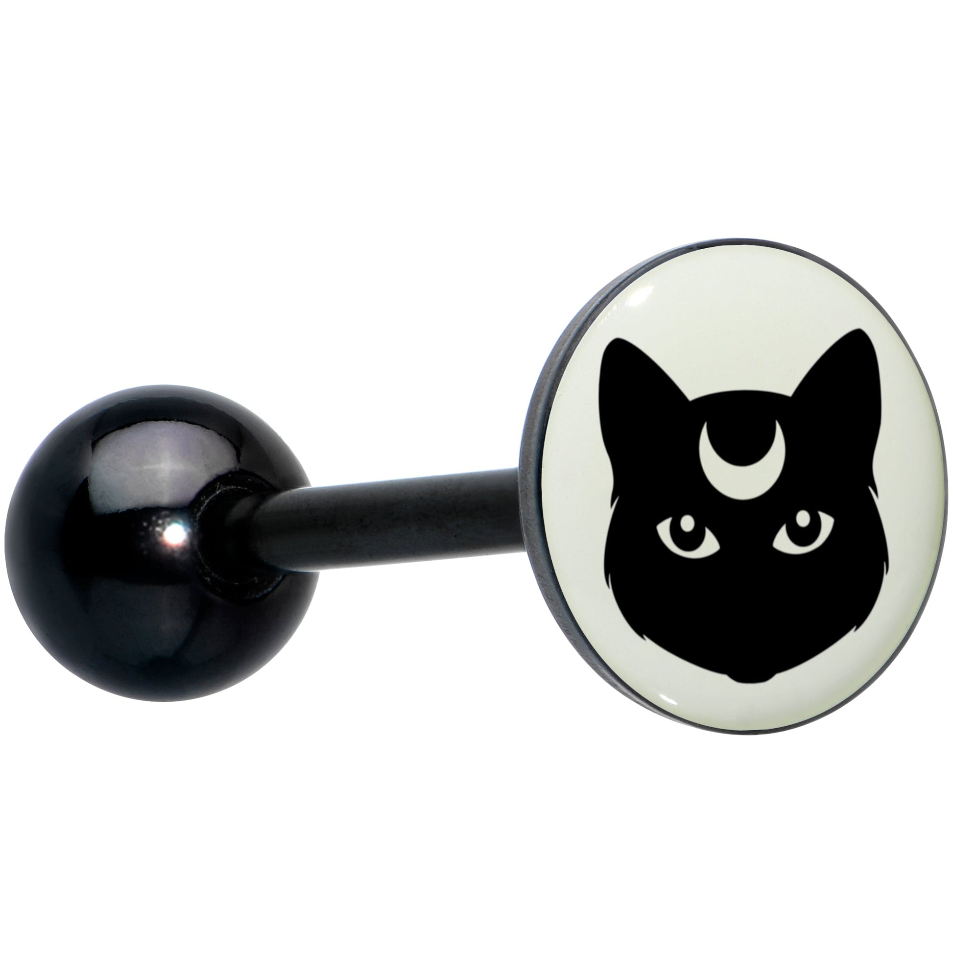 The cat on this 14 gauge tongue ring appears to have been blessed with mystic wisdom. It's made with a 5/8 inch black anodized titanium over 316L surgical grade stainless steel straight barbell with a 6mm bottom ball end. The top end features a white disc charm with a black cat's face on it. The cat has simply detailed eyes and a crescent moon on its forehead and when the lights go down it glows in the dark. Let this cryptic kitty cat cast a spell of style on your look with this delightfully mystical tongue piercing jewelry.