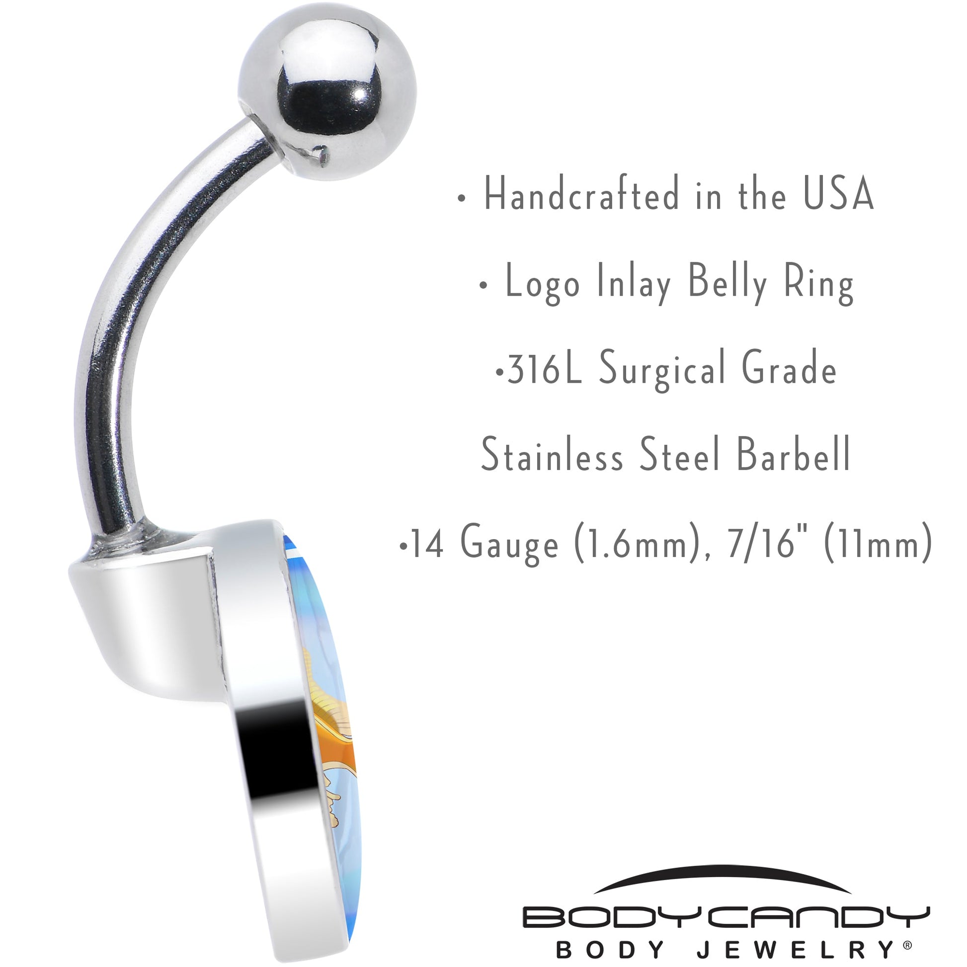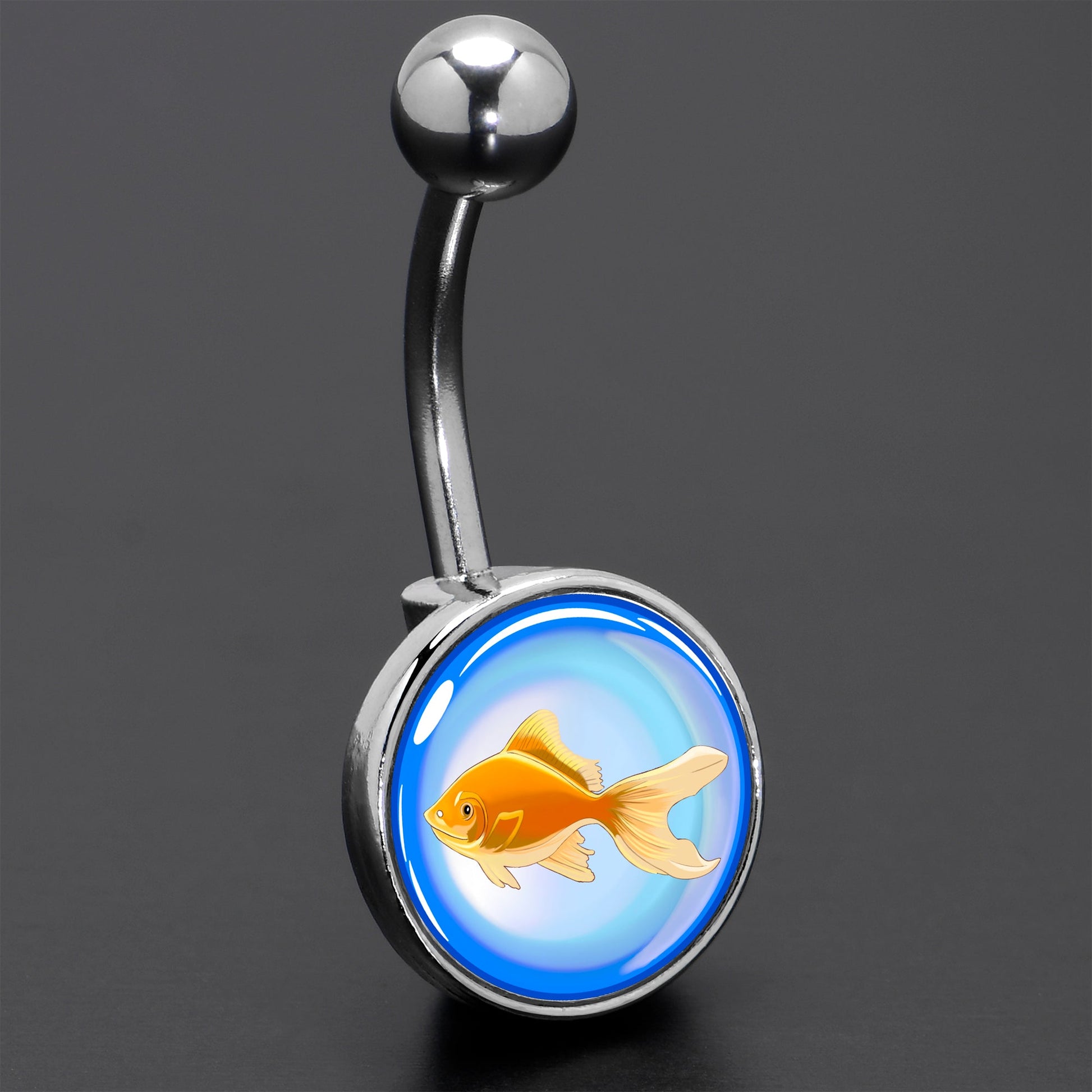 Gold is always gorgeous, but even more so when it is the goldfish on this 14 gauge navel ring. It is made with a 7/16 inch 316L surgical grade stainless steel curved barbell with a 5mm top ball end. The bottom end features a blue disc with a goldfish on it. The fish is realistically detailed, with elegantly flowing fins and intricate shading. You will be absolutely golden when you are rocking this fabulous fish belly piercing jewelry.