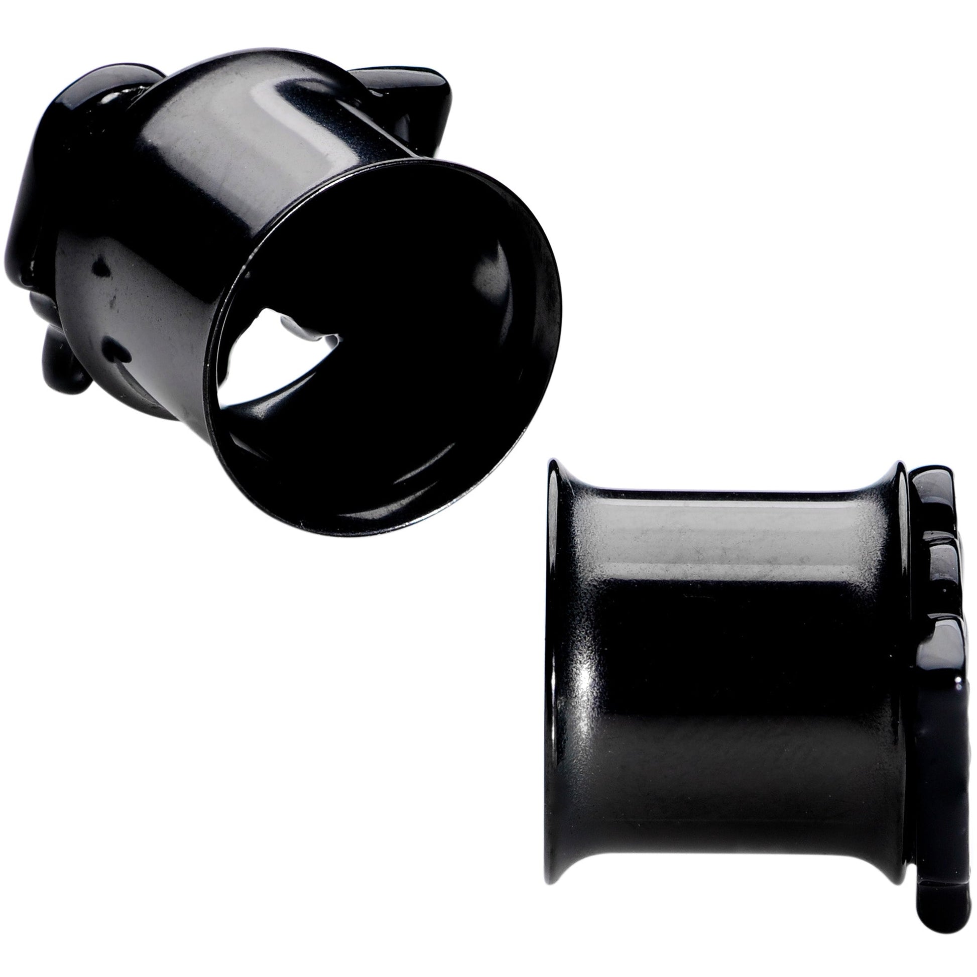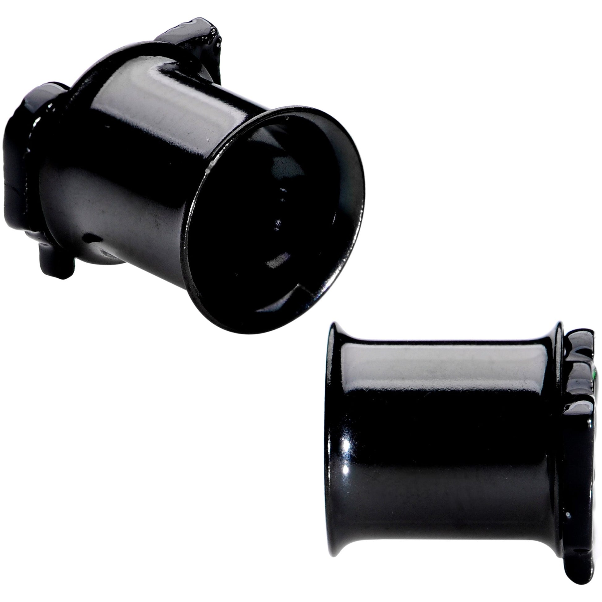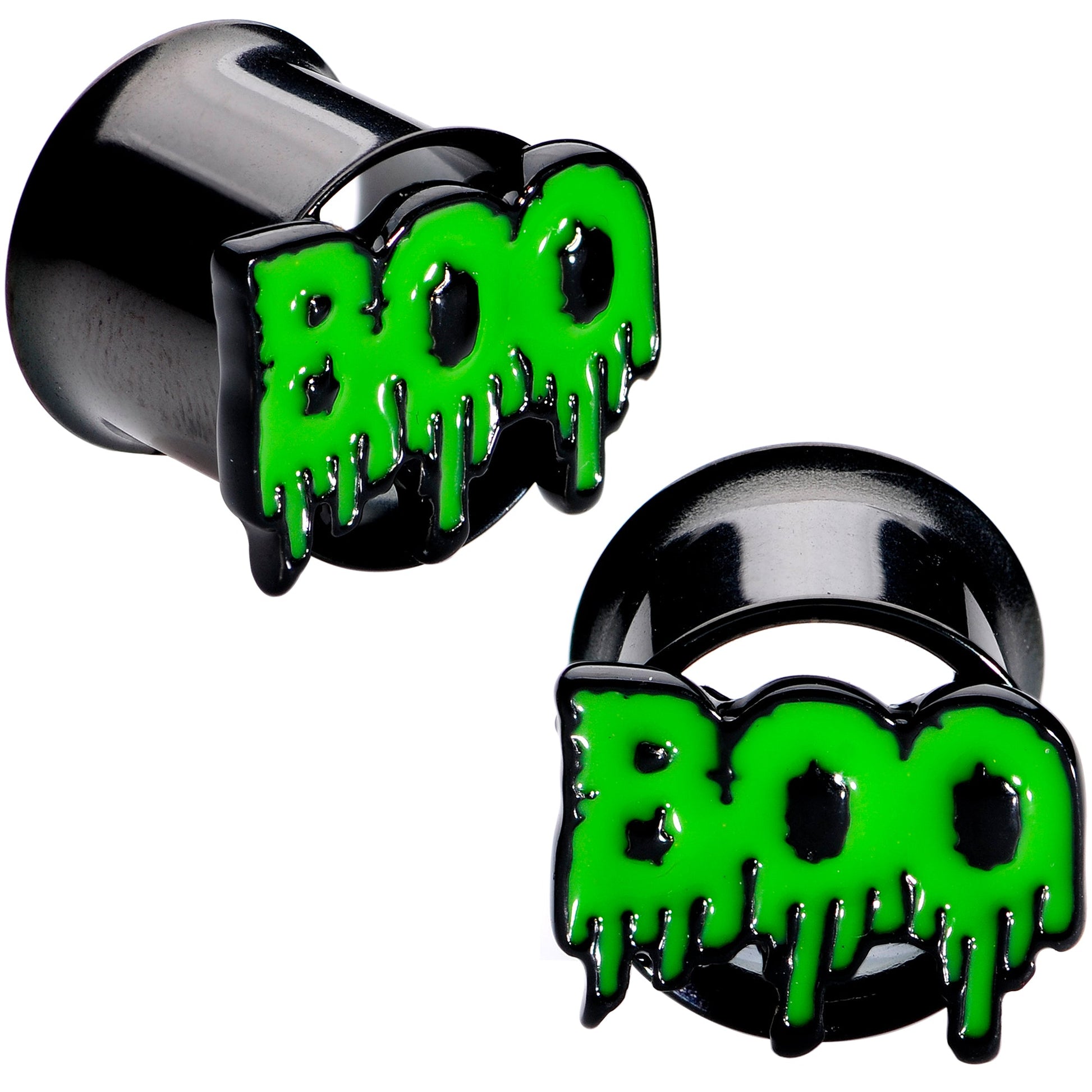 If you're looking for something spooky to wear this Halloween or anytime you're feeling scary then you will love these black ear plugs! Made with black PVD over 316L surgical grade stainless steel, these ear gauges feature bright green letters on the front that spell "BOO" in dripping, Halloween letters for tons of fun! Sold as a set of two.Specifications