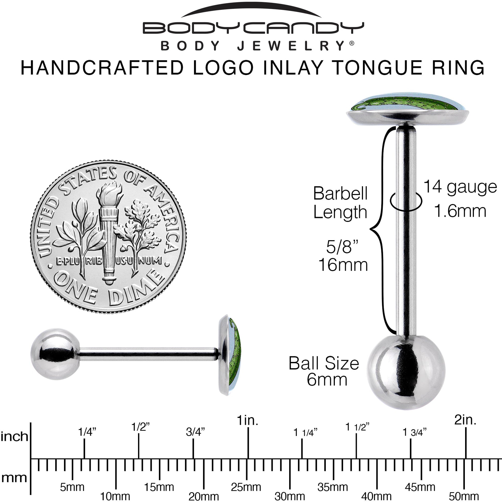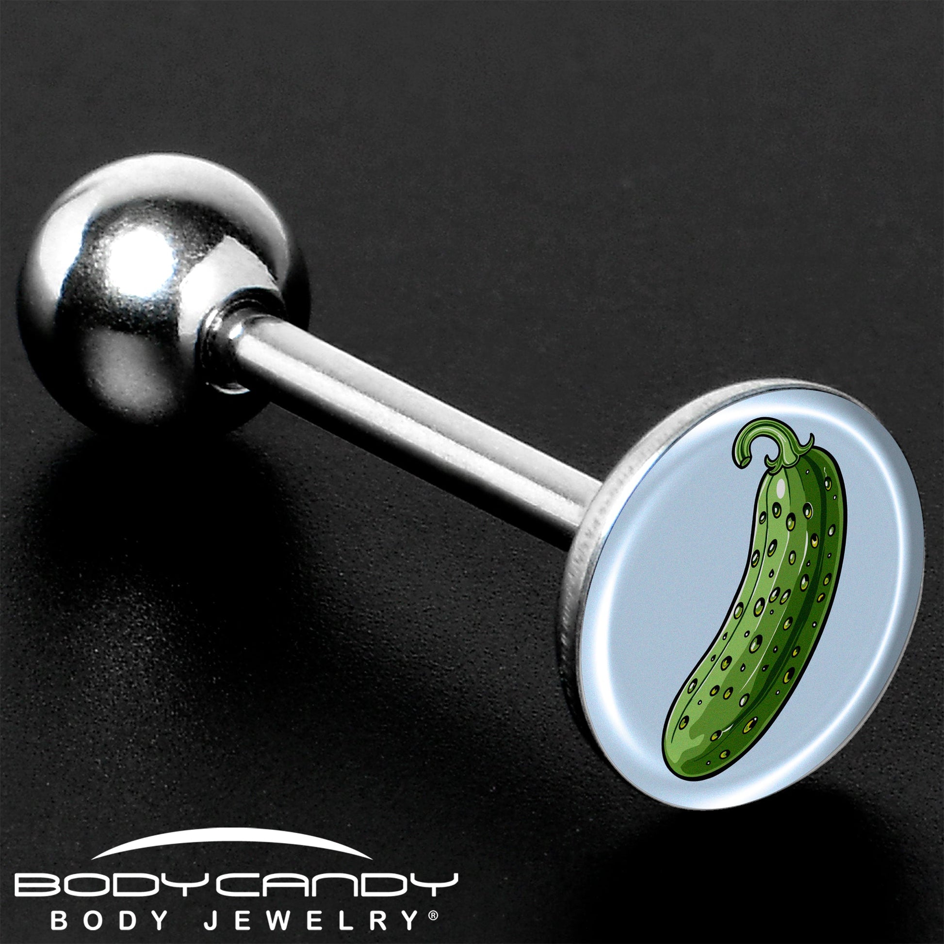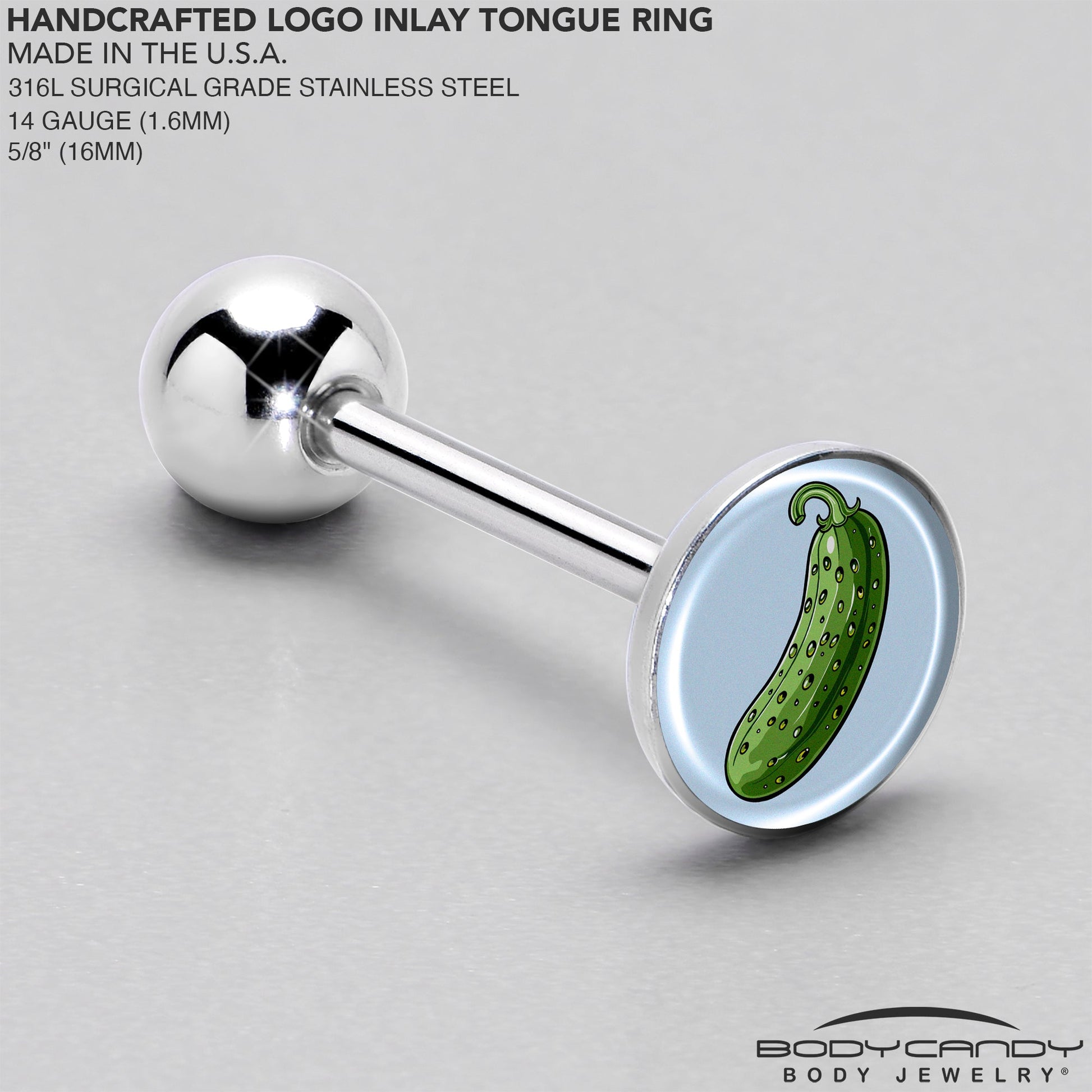 This Pickle tongue ring is a Big Dill. Made from premium 316L surgical grade stainless steel, this tongue ring boasts durability, resistance to corrosion, and a comfortable fit with its 14 Gauge (1.6mm) thickness and 5/8" (16mm) length. Artisan drawn pickle jewelry is perfect for any Pickle Lover.