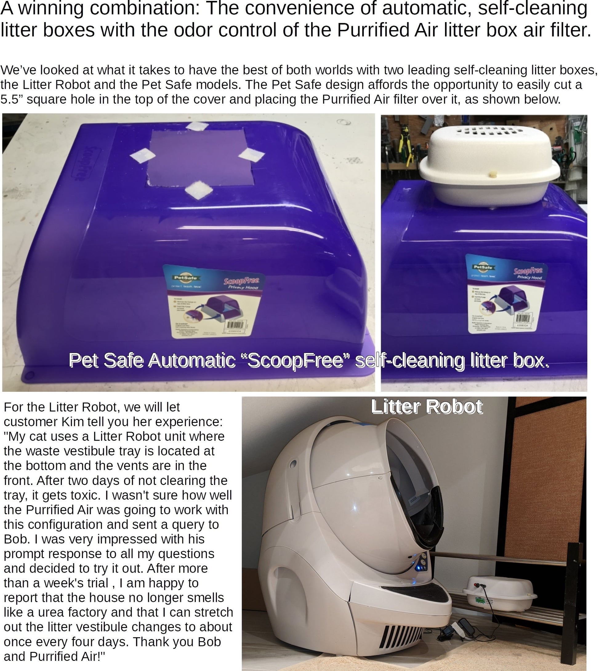 The Purrified Air Litter Box Air Filter is our primary product. Nothing is more effective against cat, ferret and other small animal odor. Our Air Filter combines several proven,  new and established odor-destroying technologies, specifically targeted to pet odor, allergens and pet dander. It is adaptable to most covered and open litter boxes, ferret cages and mobile homes. Check which accessories you may need for your particular setup. The three Discount Groups offer savings of $20 compared to separate item pricing.