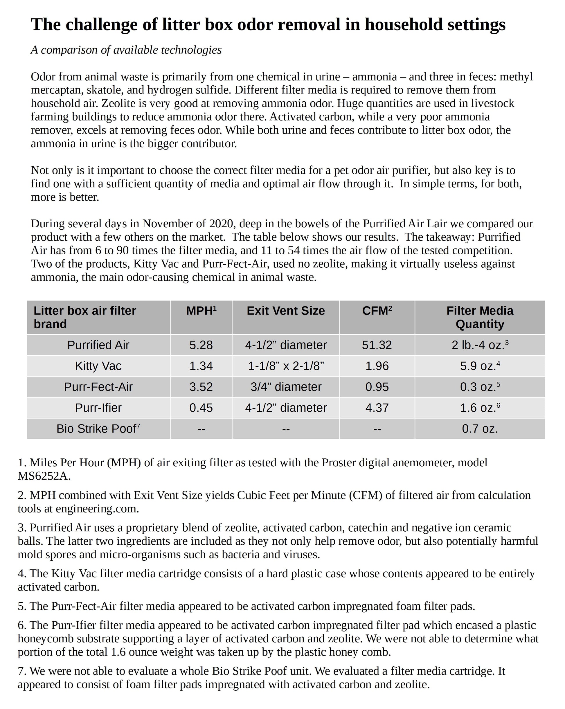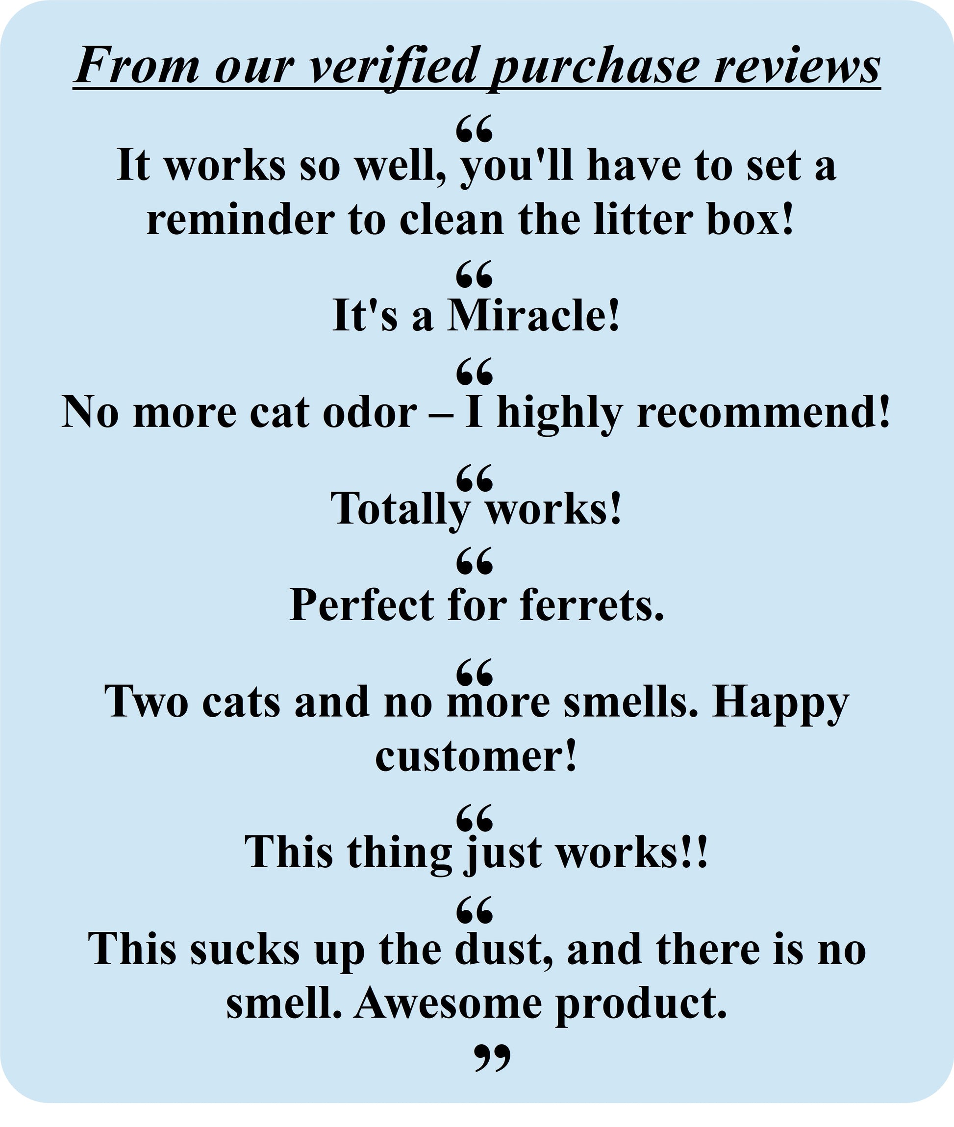 • Our powerful but quiet fan with speed control and on/off switch forces 53 cubic feet per minute through a 2" thick, 2.2 pound proprietary blend of filter media targeted specifically on cat odor and does the job like no other. Our "tackified" prefilter pad captures more kicked up litter dust. Filter media pack lasts 4-7 months on average before replacement is necessary. Let your nose be your guide.