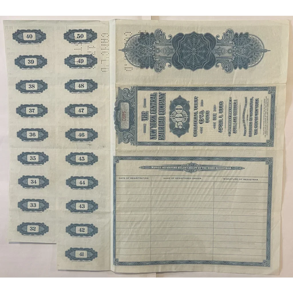 This antique vintage gold bond certificate is not just a piece of paper – it's a slice of American history. With the merger of the New York Central and Pennsylvania Railroad in 1968 to form Penn Central, certificates like these became relics of a vanished era. The blue 1955 certificates are among the last of their kind, making this an incredibly rare find. Don't miss this opportunity to own a piece of railroad history!