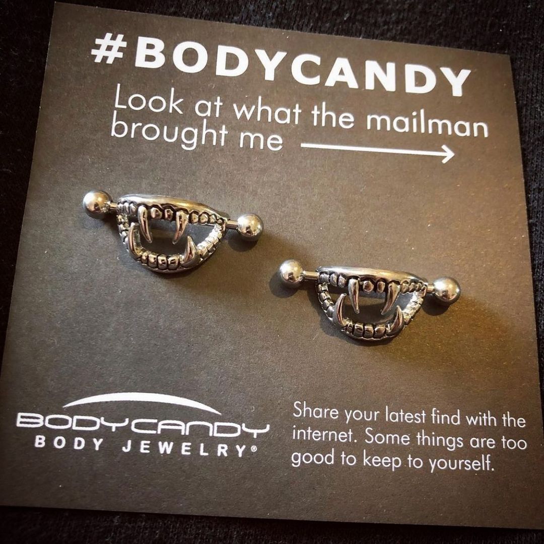 Sink your teeth into your style with this cool demon fangs nipple ring. Showcase your hellion side with this surgical steel nipple shield barbell. This demon mouth nipple shield set features 18mm length barbells with a 10mm opening for the fangs.