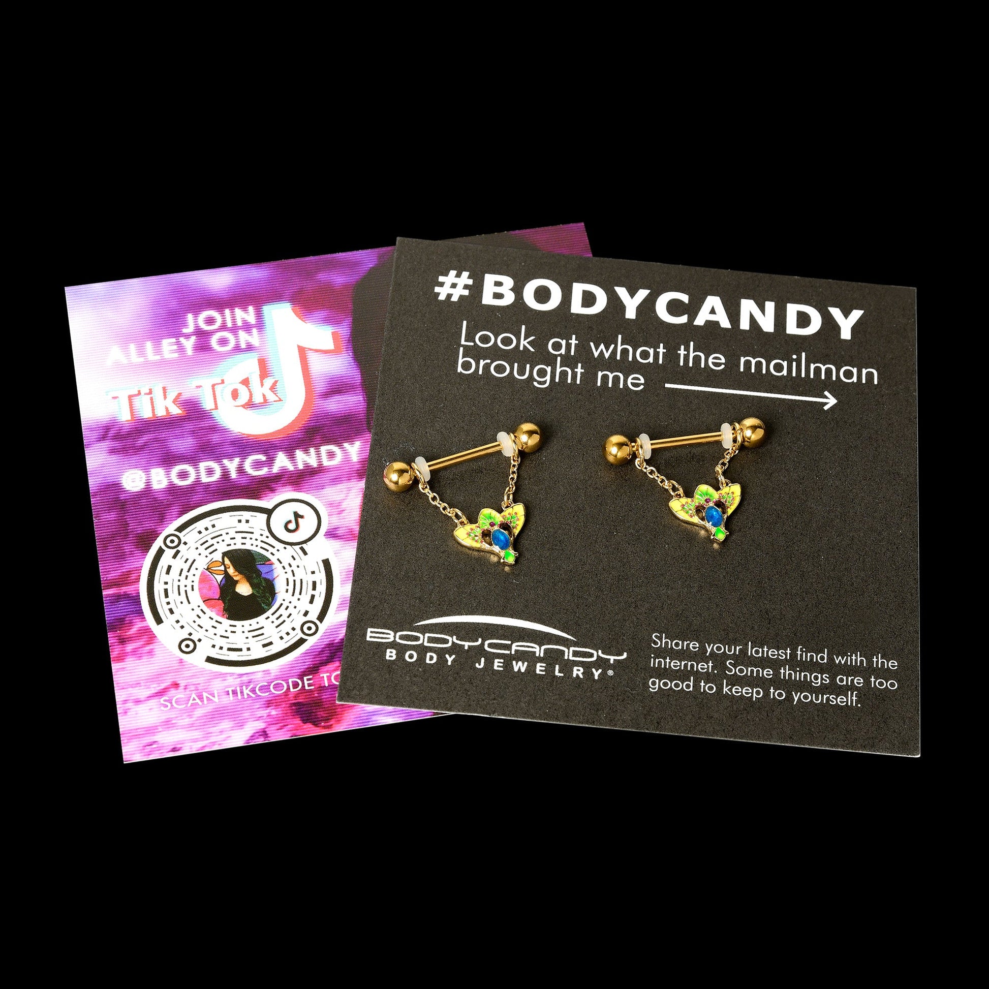 Take your look to the tropics with this 14 gauge nipple jewelry! It's made with 14mm wearable length gold tone PVD over 316L surgical grade stainless steel straight barbells with 5mm ball ends. Each one features a length of matching chain that supports a tropical charm of green and yellow leaves. The fans are set with a blue gem at the tops, with small purple gems beneath and flanked by pairs of smoky yellow gems for a truly luxurious appearance. You're sure to be a fan of these tropical fan nipple piercing rings! Sold as a set of two.