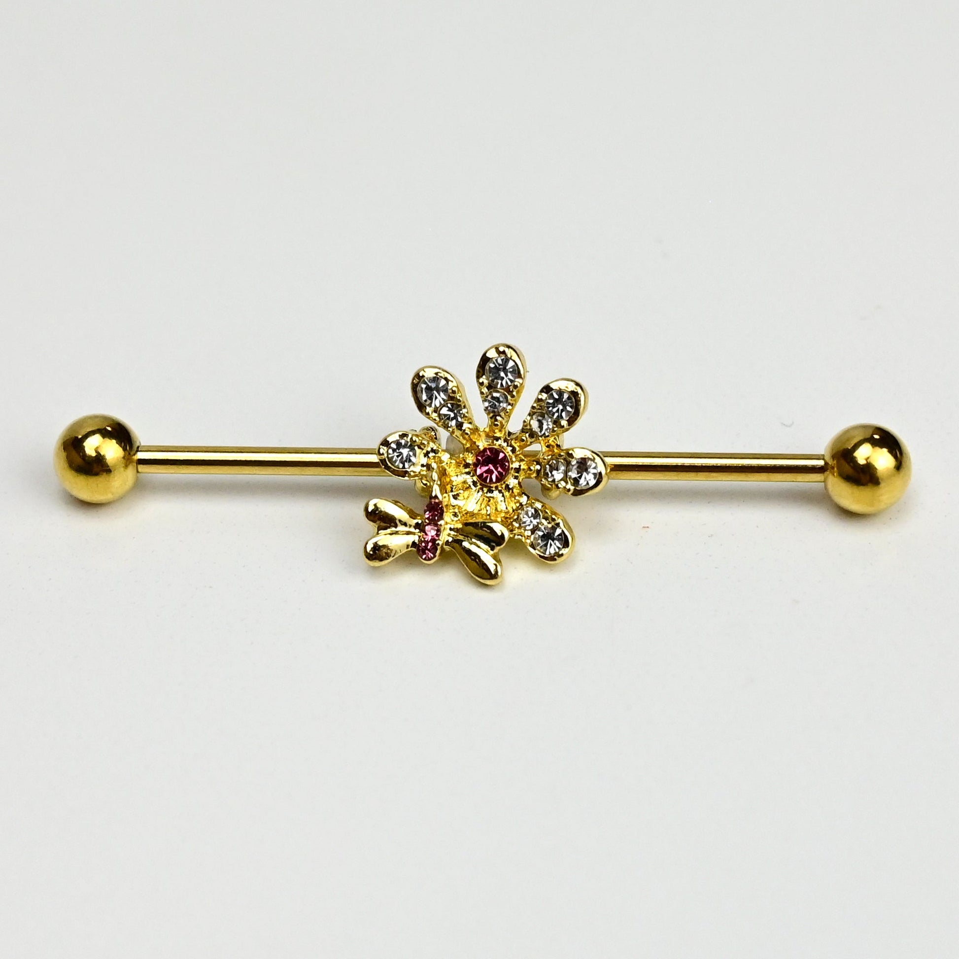 14 Gauge Clear Gem Gold Tone Classic Bee Flower Industrial Barbell 38mm