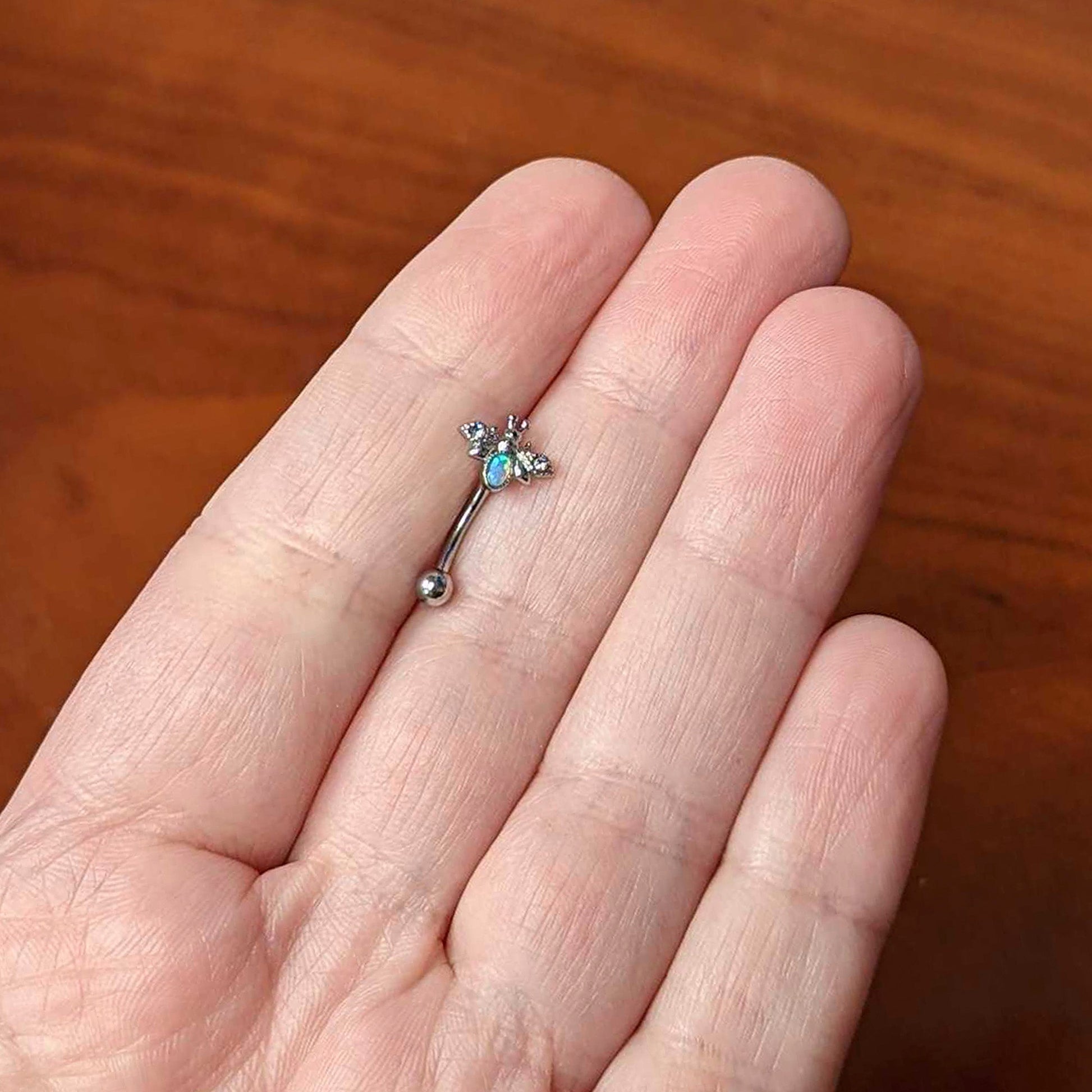 You'll be the hottest honey in the hive when you're rocking this 16 gauge eyebrow jewelry! It's made with an 8mm durable 316L surgical grade stainless steel curved barbell with a 3mm bottom ball end. The top end features an insect charm, with its body composed of a white synthetic opal. The insect's wings are set with clear gems for an touch of glamour. You can even boast this bug in multiple piercings including tragus, rook, and eyebrow piercings. You won't have to let boring jewelry bug you when you've got this gorgeous insect tragus jewelry in your cartilage piercing!