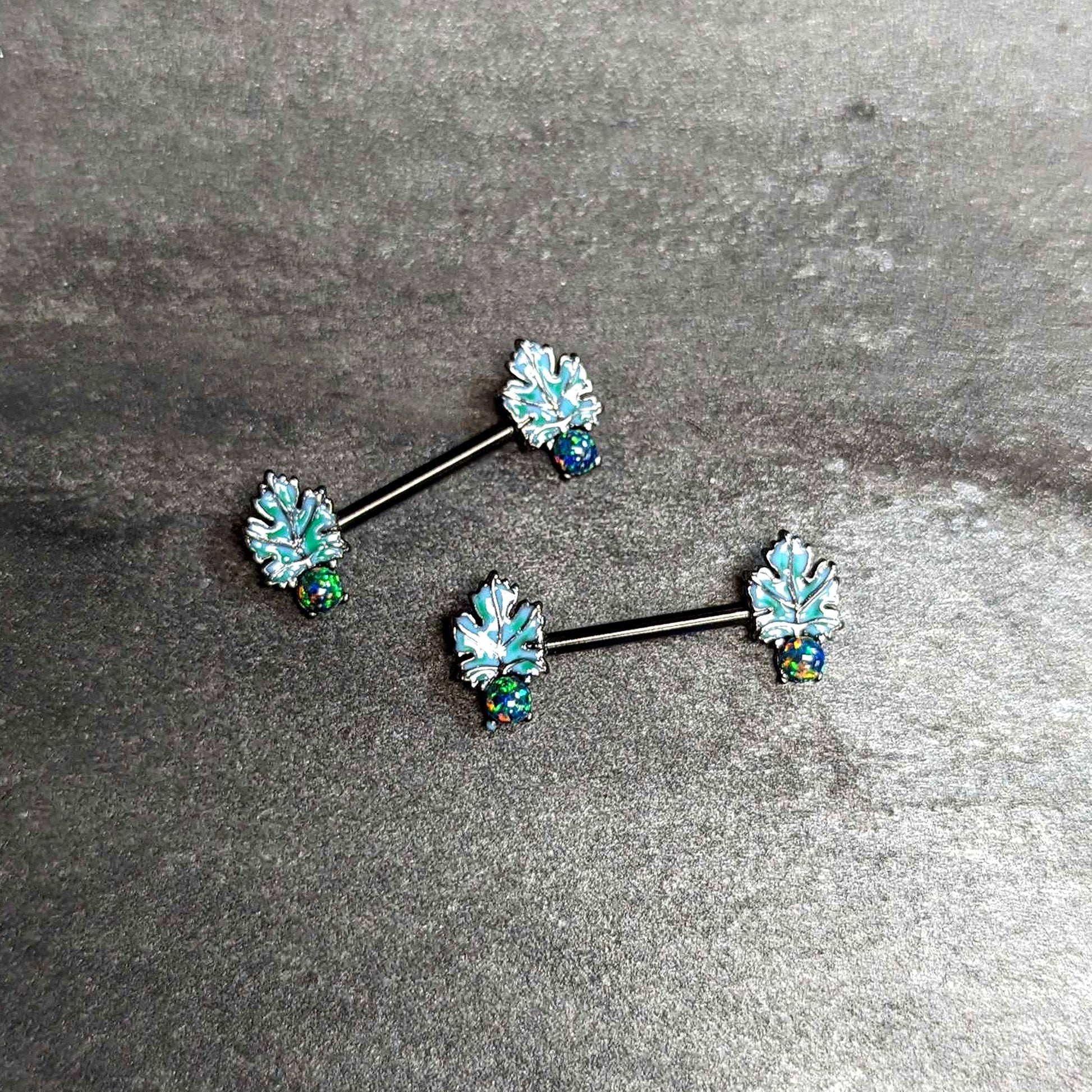 14G 1/2 Green Synthetic Opal Black Fall Leaf Nipple Ring Set