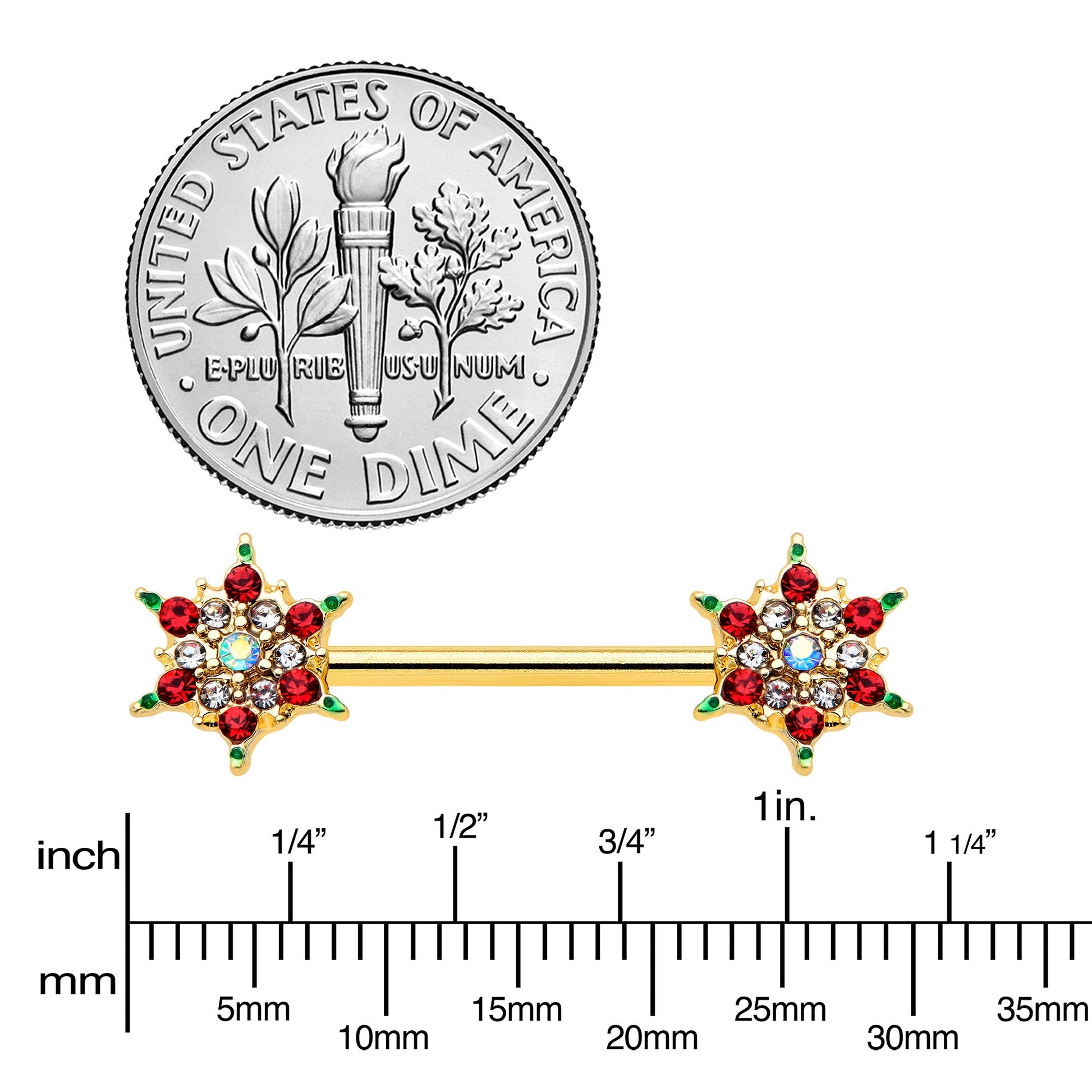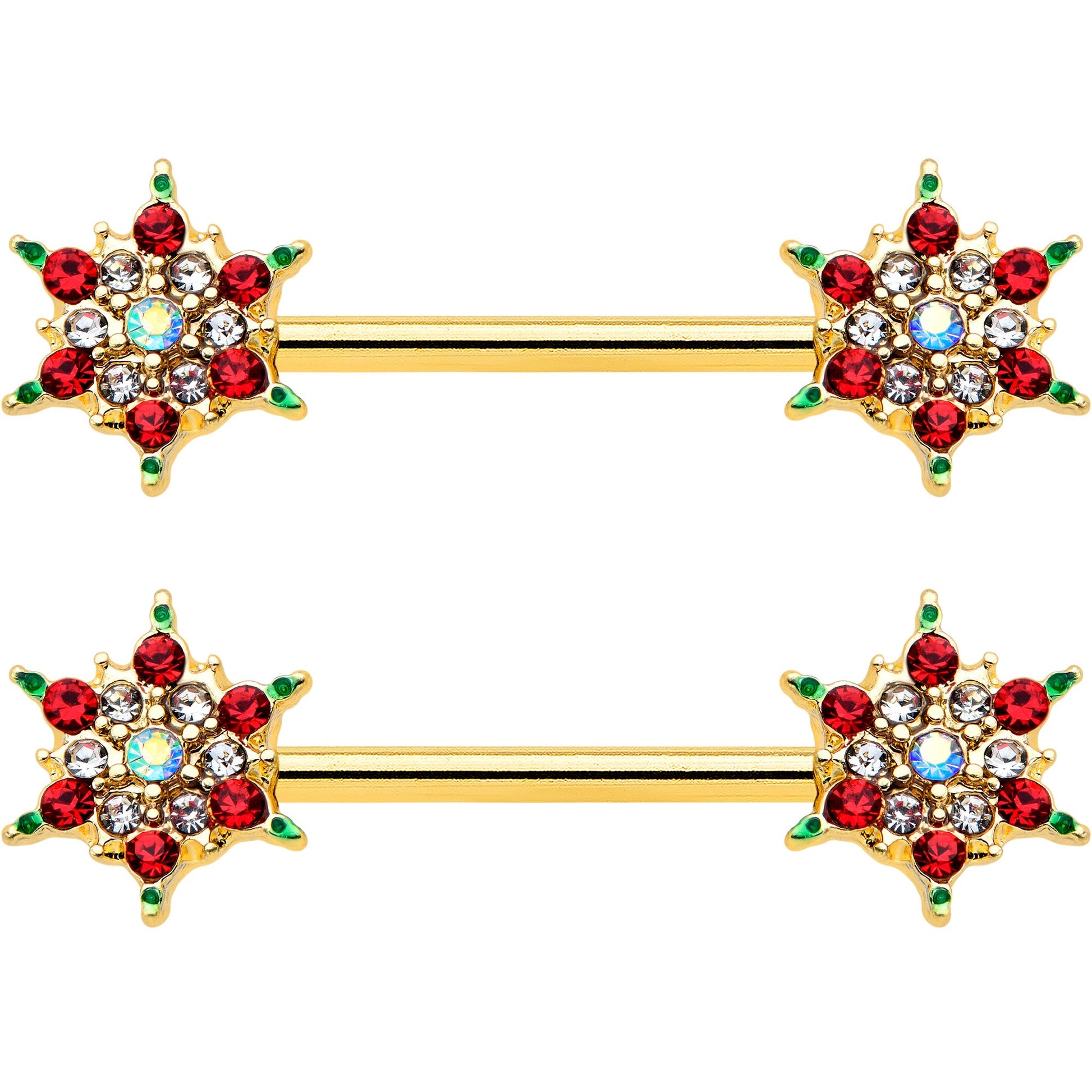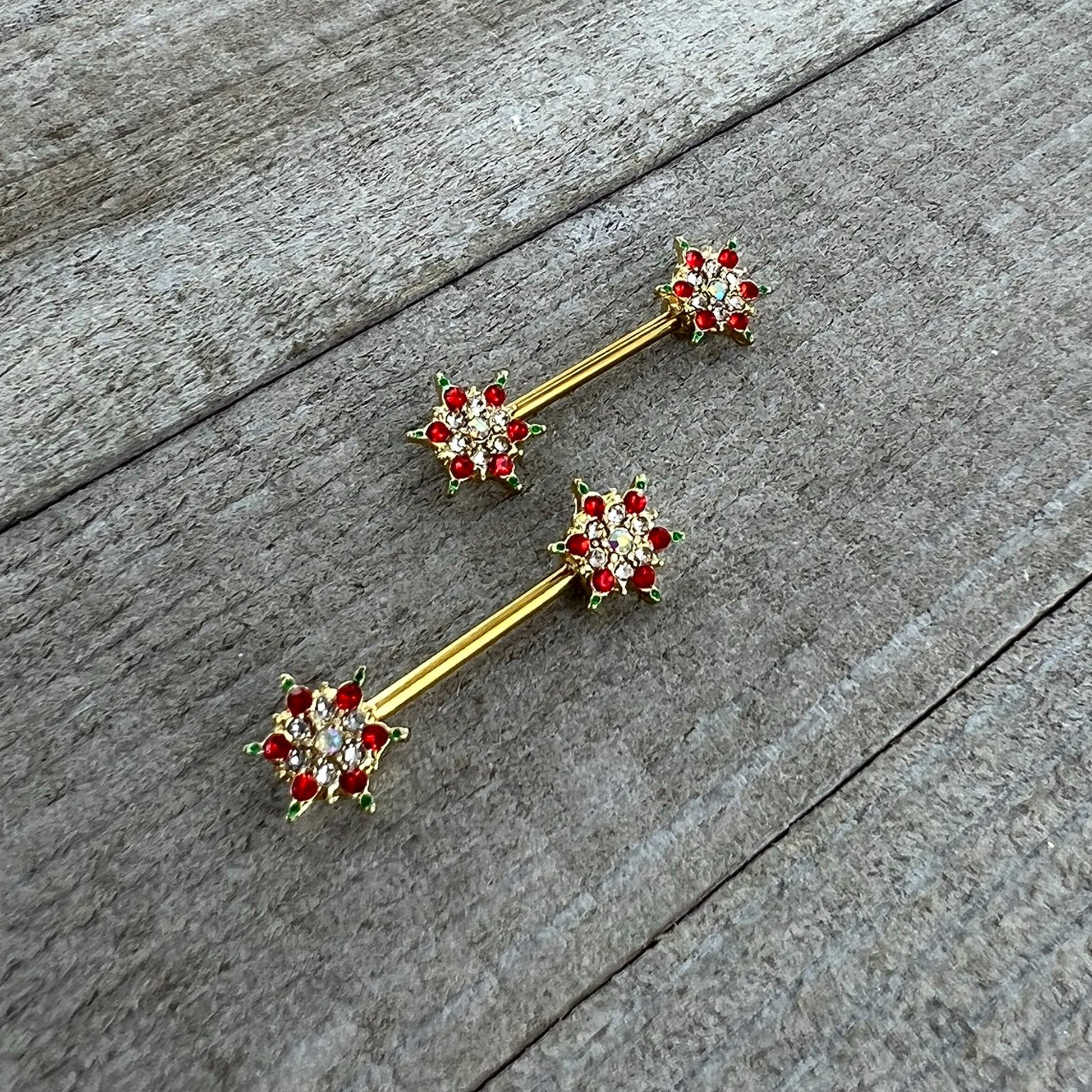 Even if you're not rolling in cash, you can look super rich when you're rocking this 14 gauge nipple jewelry this Christmas! It's made with 14mm gold tone PVD over 316L surgical grade stainless steel straight barbells. Each of the ends features a snowflake charm with rich red gem and green embellishments, connected with a ring of clear gems and finished with an aurora gem center. Whether you're rich or just have upscale taste, these holiday nipple piercing rings will make you feel like a million bucks! Sold as a set of two.