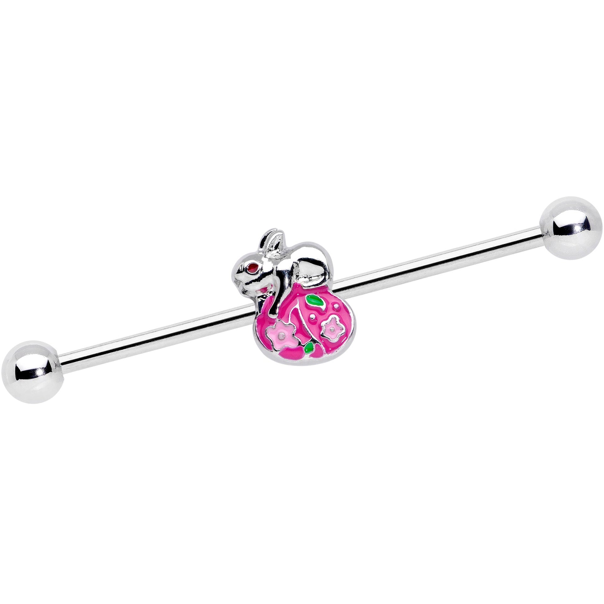 If you're a big fan of all things spring then you will love this 14 gauge industrial barbell with Easter style! Made with a 1 1/2" durable 316L surgical grade stainless steel straight barbell, this double helix earring features a colorful Easter egg charm with a bunny rabbit on top that you can move up and down the barbell.