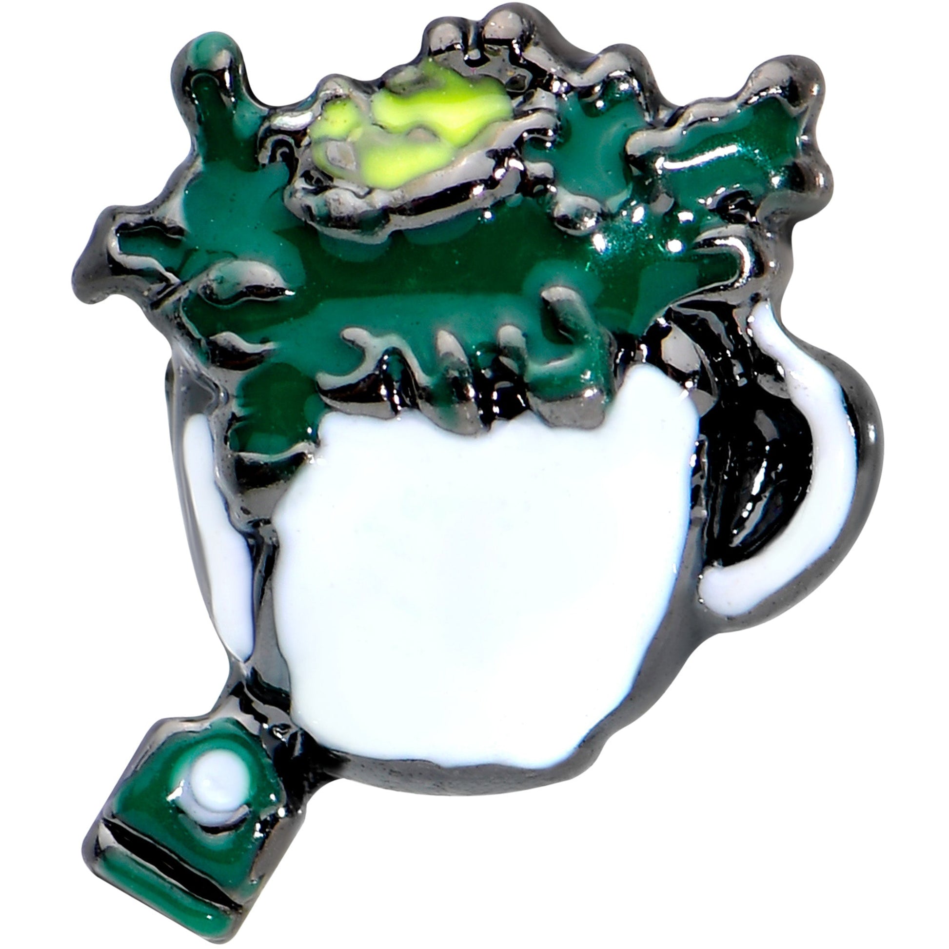 Everyone likes a nice cup of tea....but the one on this 16 gauge cartilage jewelry looks like a spooky witch's potion! It's made with a 6mm black PVD over 316L surgical grade stainless steel straight barbell with a flat disc end. It features a white teacup charm, filled with an ominous teal potion that appears to splash out of the mug. You can even sport this spooky brew in multiple piercings including tragus, helix, and some conch piercings. Add a touch of the ominous to your cartilage piercing with this terrifying teacup tragus ring!