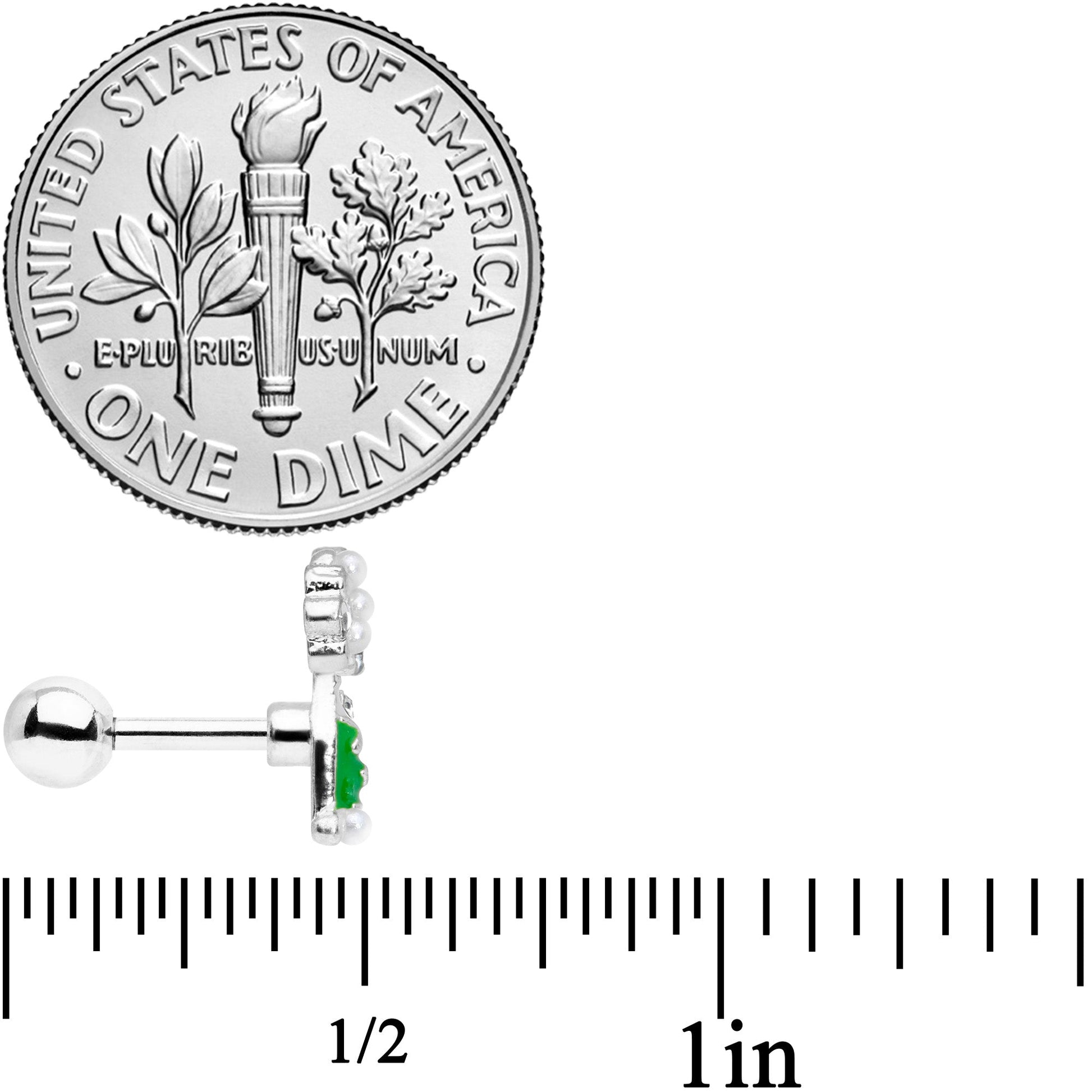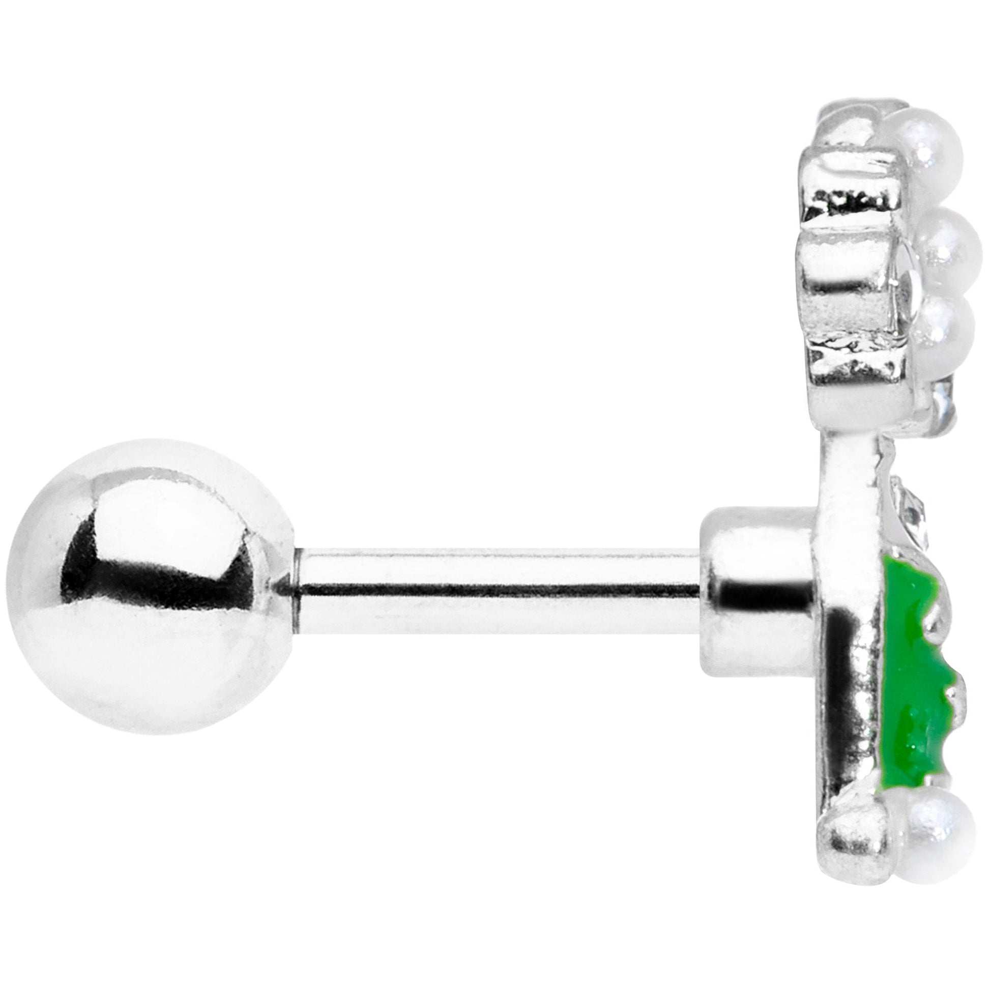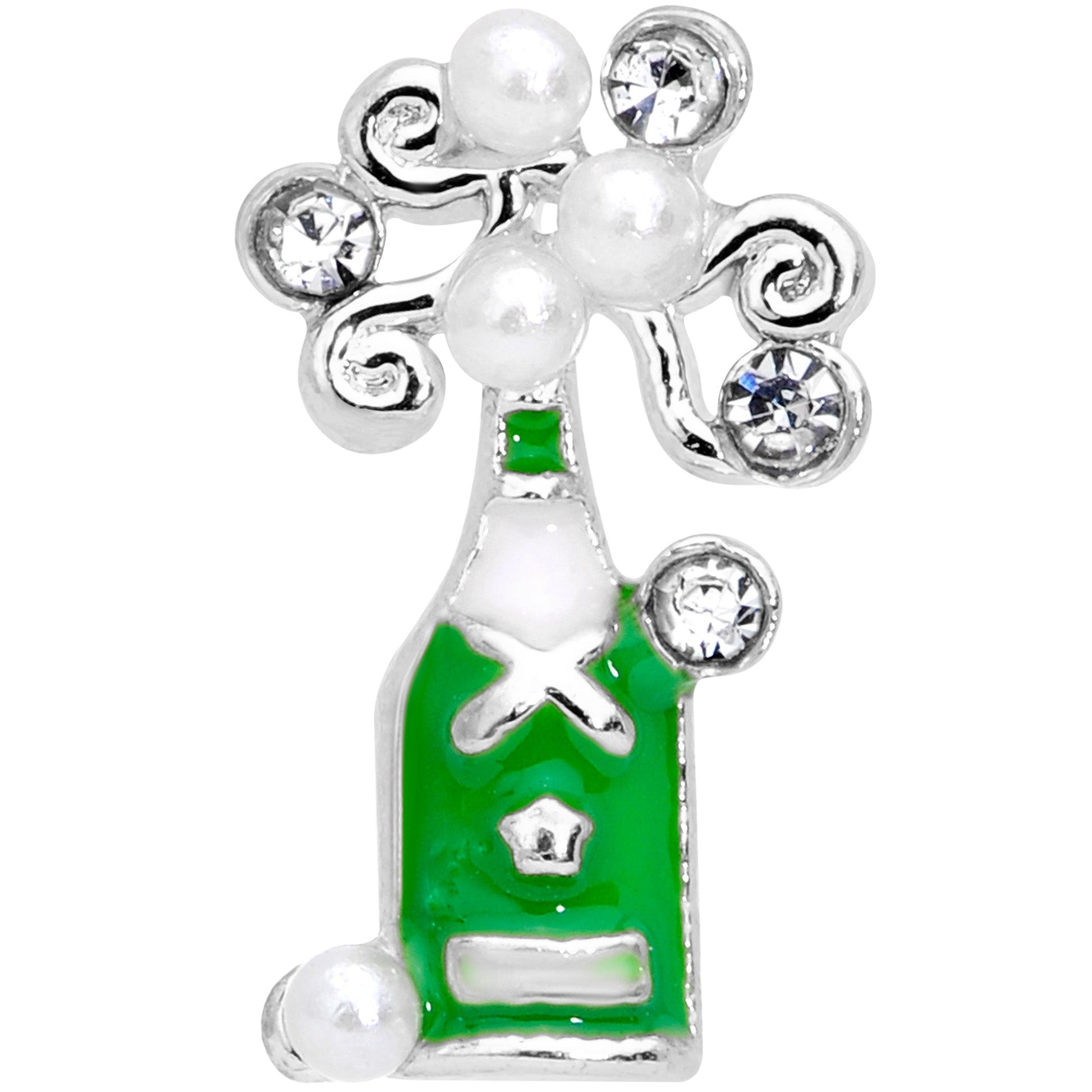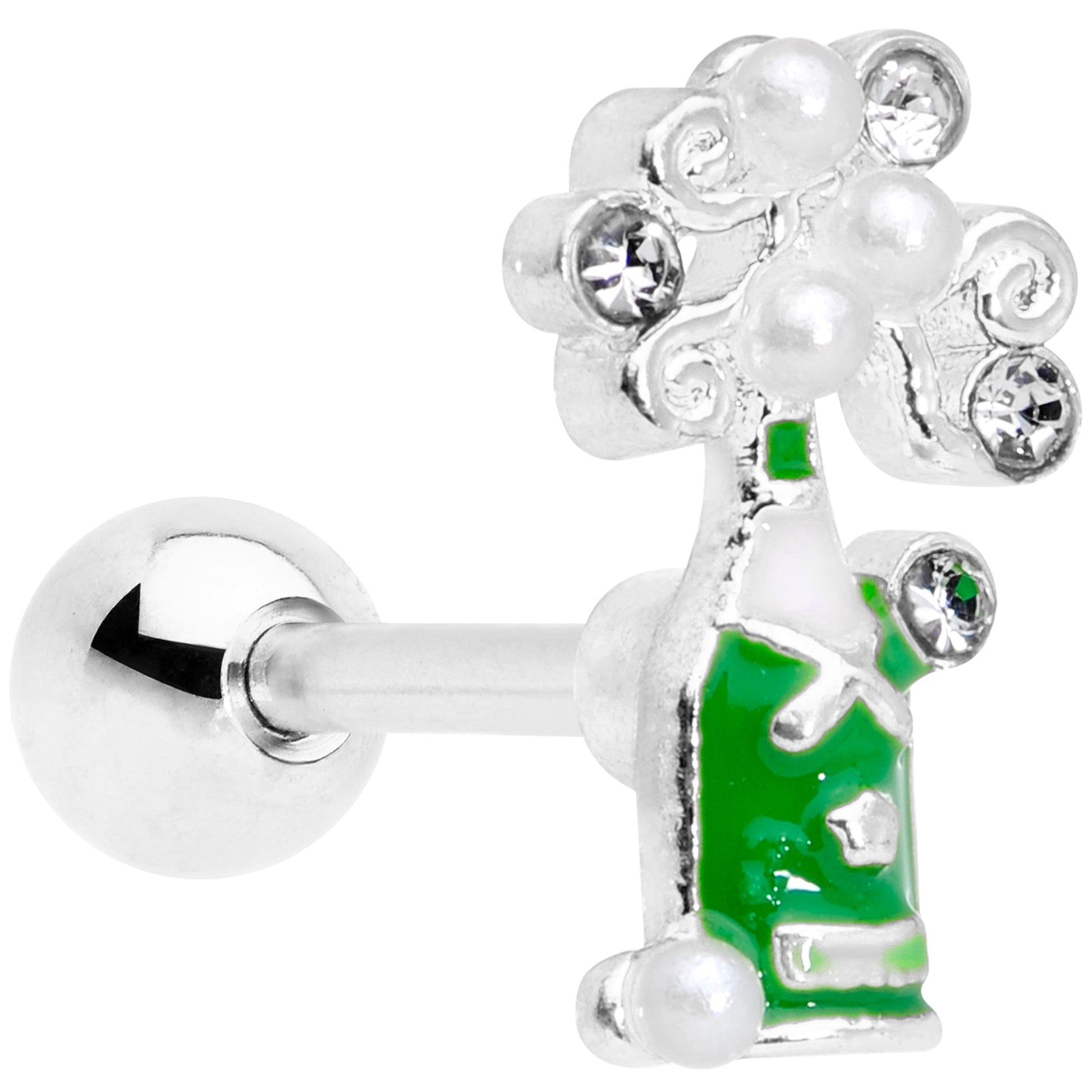 Oooh, check out that bubbly beauty for New Year's Eve! This 16 gauge tragus stud is made with a 6mm durable 316L surgical grade stainless steel straight barbell with a 4mm ball end. It features a green champagne bottle charm with white detailing. The bottle is crowned with clear gems and pearlescent white orbs, as though it were foaming, reminiscent of a New Year's Eve celebration. Even better, this cartilage earring can be worn in a variety of piercings including the helix, tragus, and some conch piercings. Grab a glass, it's time to toast the holidays with this festive cartilage stud!