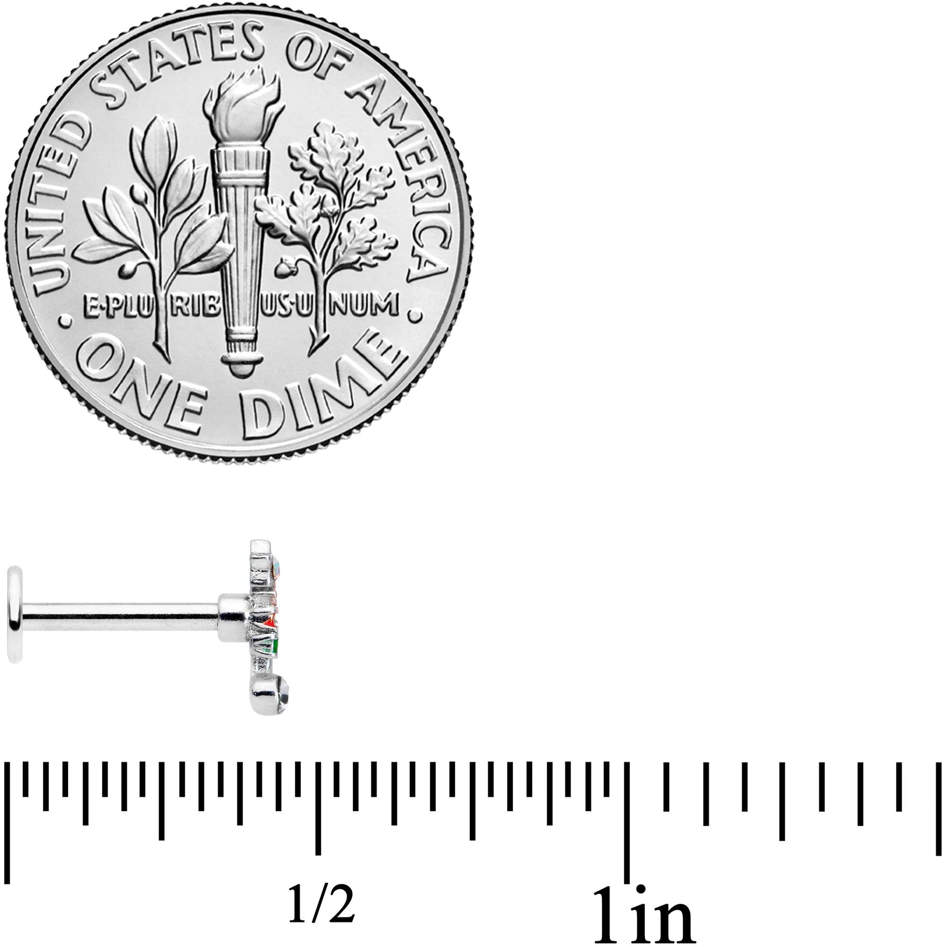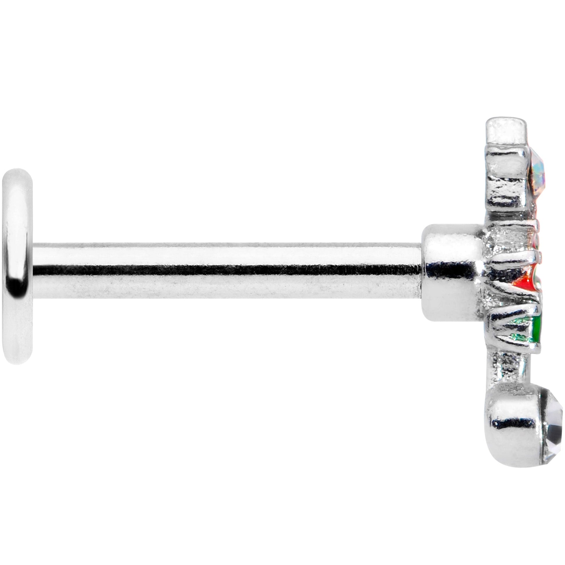 If you're ready to celebrate the holidays by switching out your helix jewelry you'll love this 16 gauge labret stud with tons of Christmas style. Made with an 8mm durable 316L surgical grade stainless steel straight barbell with a flat backing, this monroe jewelry features a red and green gem Christmas tree charm with an aurora gem star on top too, and can be worn in a variety of piercings including your labret and monroe as well as cartilage piercings like your tragus, helix, some conch piercings, and more!