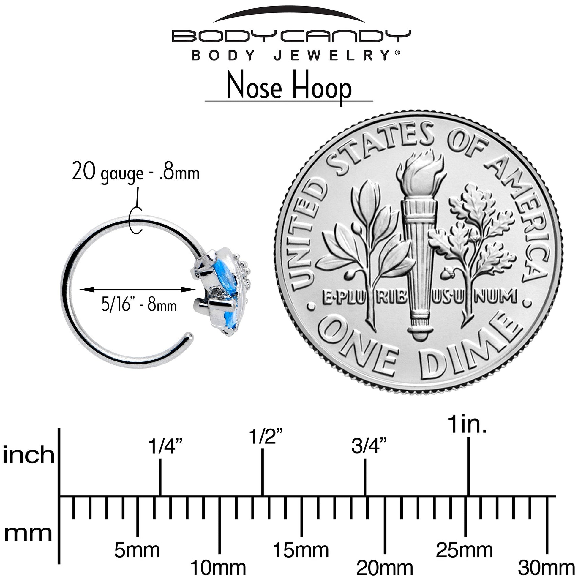 You're sure to be a fan of this 20 gauge nostril ring. It's made with an 8mm durable 316L surgical grade stainless steel circular ring. It features a pair of blue cubic zirconia gems fanned out and set above a swirl embellishment. At the base are clear cubic zirconia gems for an added touch of style. This nose piercing jewelry has so much glamour it'll make your head swirl.