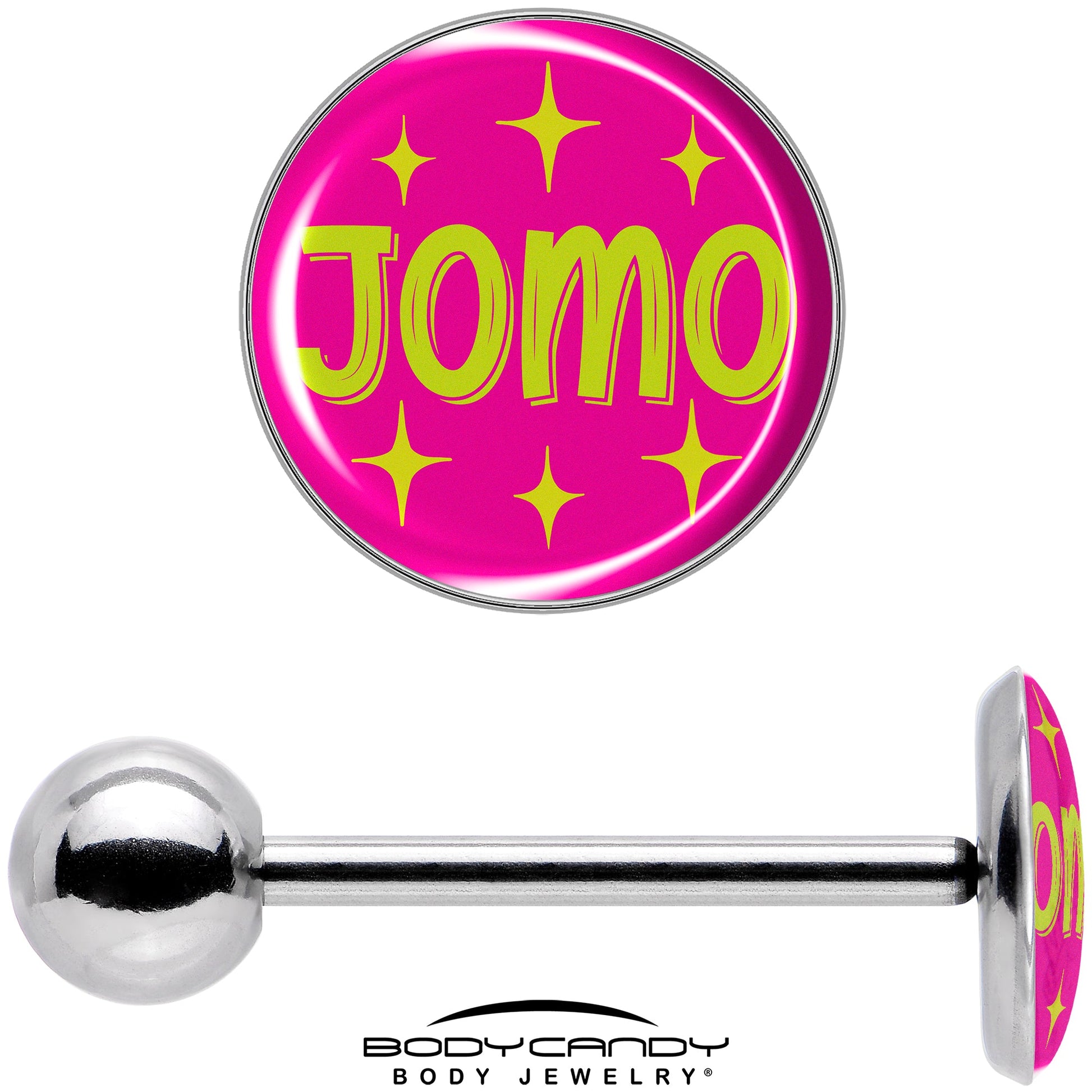 You know you're not missing out on anything so tell the world with this 14 gauge tongue barbell. It's made with a 5/8 inch 316L surgical grade stainless steel straight barbell with a 6mm bottom ball end. The top end features a pink disc logo charm with yellow star embellishments. In the center is the acronym JOMO in matching yellow script for a look that's both whimsical and stylish. You won't be missing out on colorful fashion when you're rocking this colorful tongue piercing jewelry.