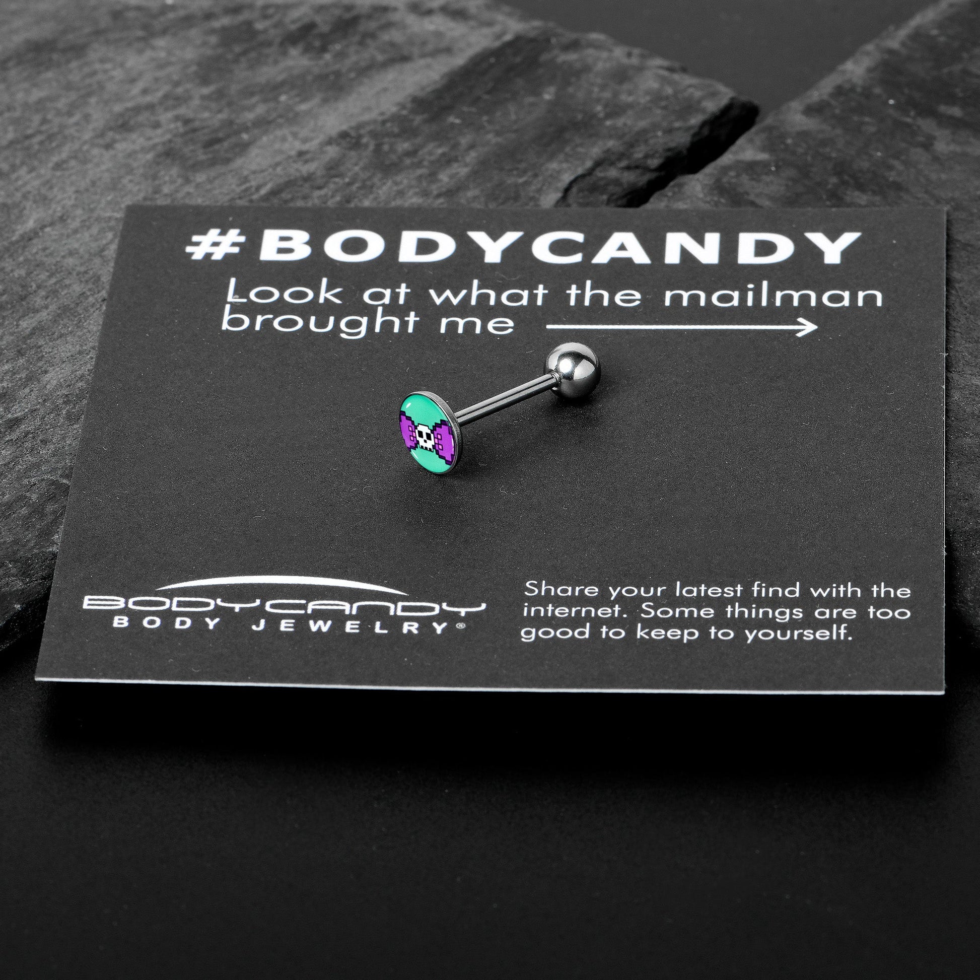 Go old-school 8-bit retro with this 14 gauge tongue jewelry! It's made with a 5/8" durable 316L surgical grade stainless steel straight barbell with a 5mm bottom ball end. The top end features a green disc-shaped skull charm. The skull is set at the center of a purple bow and both are styled in a retro pixelated fashion, perfect for goths and gamers alike! Go back in time in style with this old-school skull-themed tongue piercing ring!