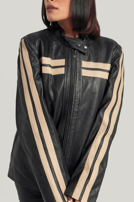 Oversized Black Jacket with White Stripes Retro Bomber Leather Jacket Handcrafted & Designed by Ox and Bulls