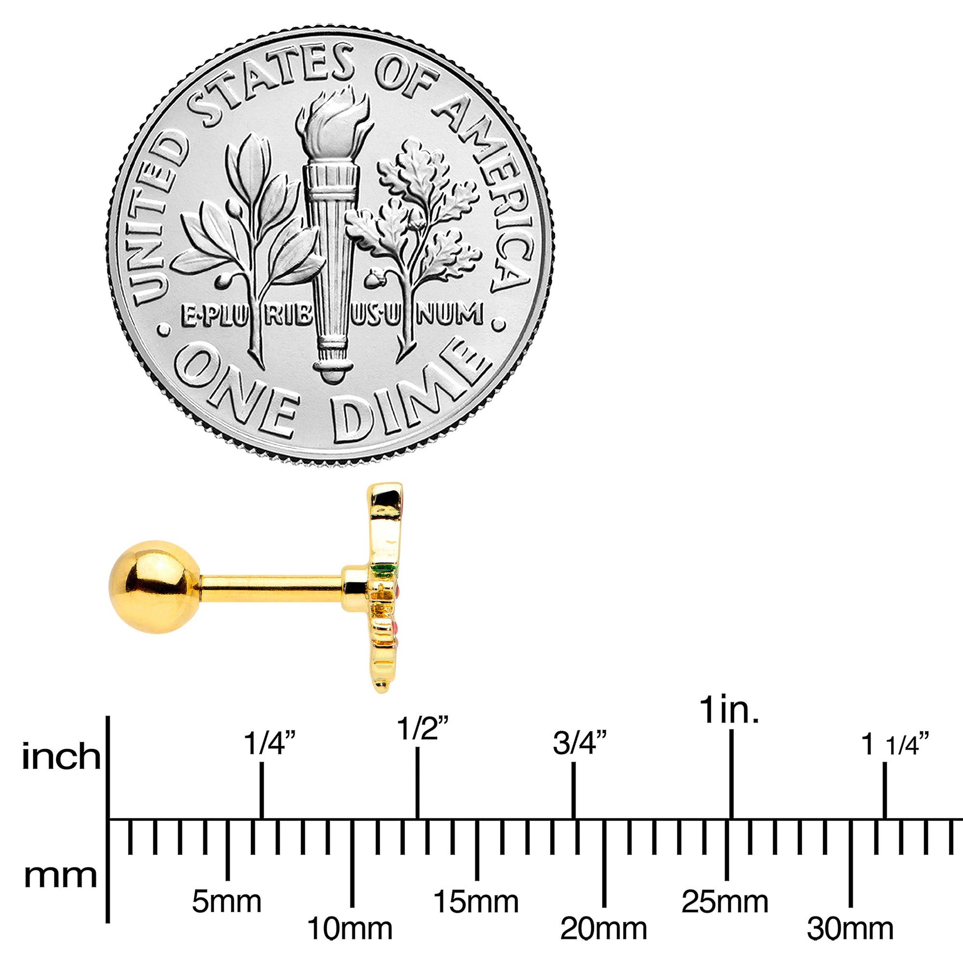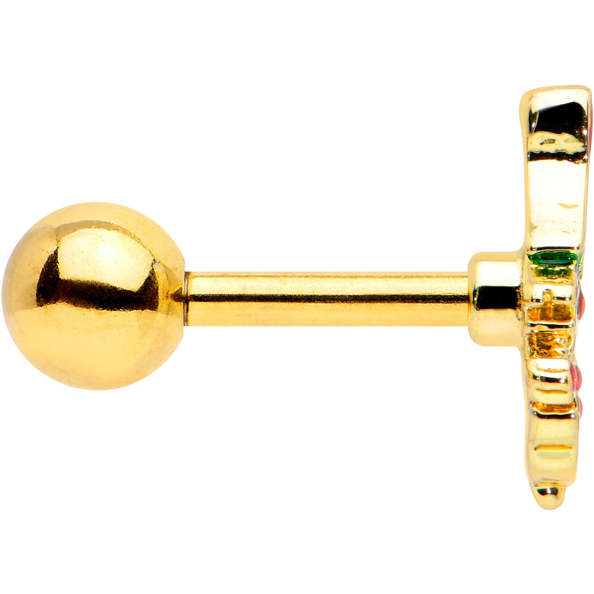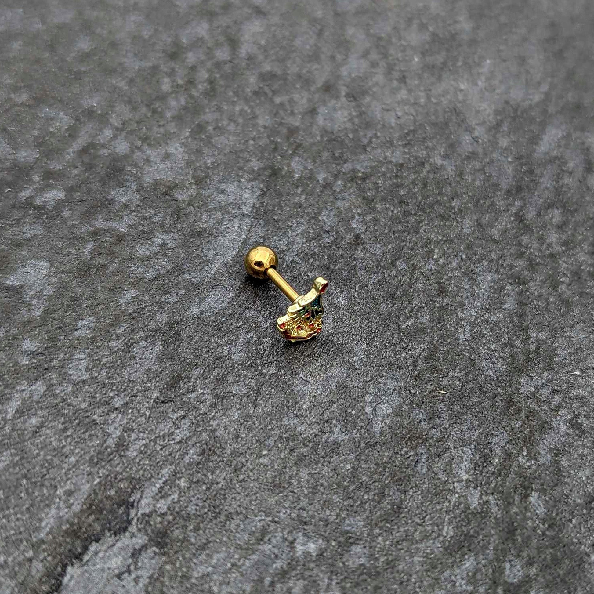 Deck your piercings with this 16 gauge tragus stud! It's made with a 6mm gold tone PVD over 316L surgical grade stainless steel straight barbell with a 4mm ball end. It features a festive Christmas tree, with green and blue inlay. It's further embellished with red gem orbs and a red gem inlaid star on top. You can rock this tree around multiple piercings including tragus, helix, and some conch piercings. You'll be feeling fabulous and festive when you're rocking this Christmas cartilage jewelry around!