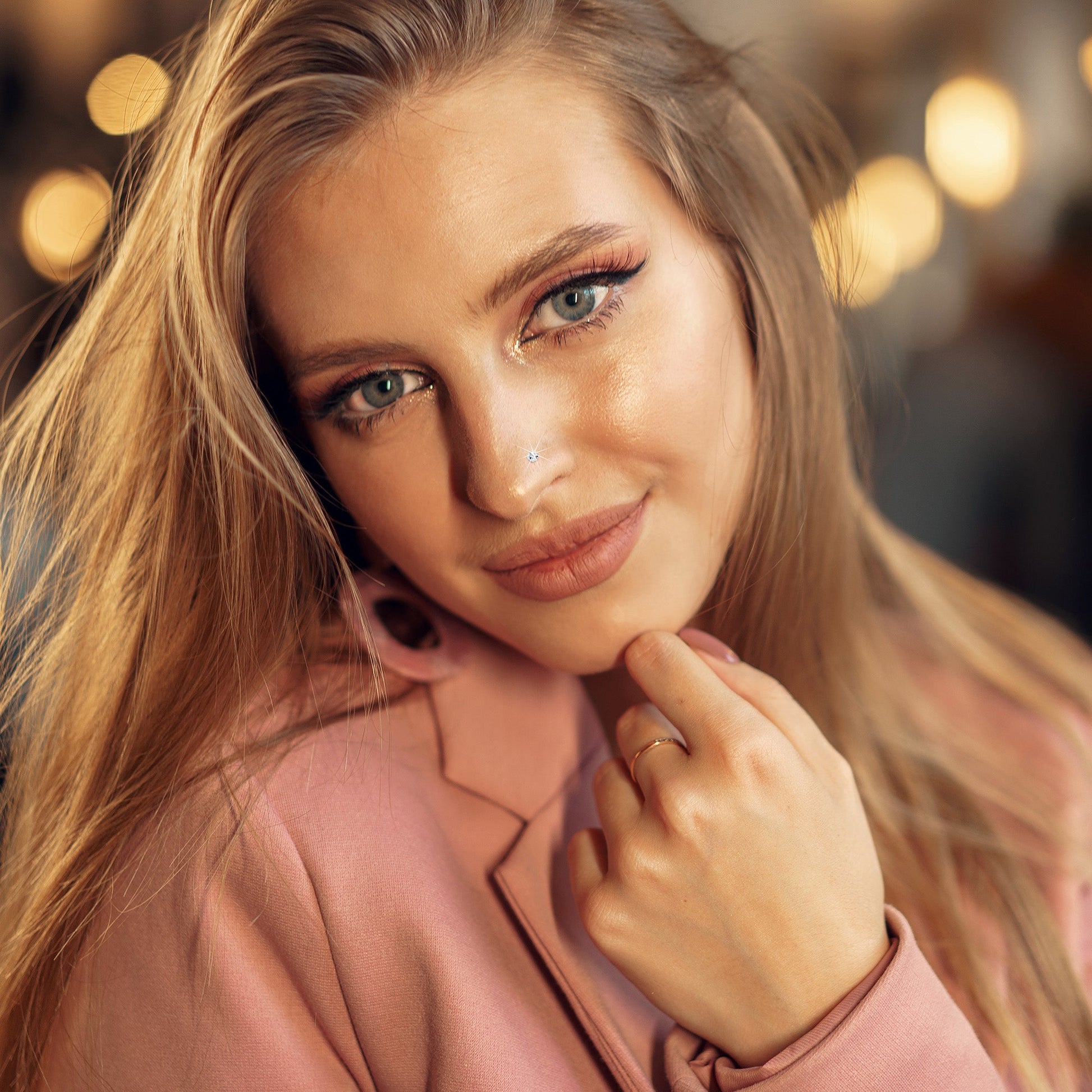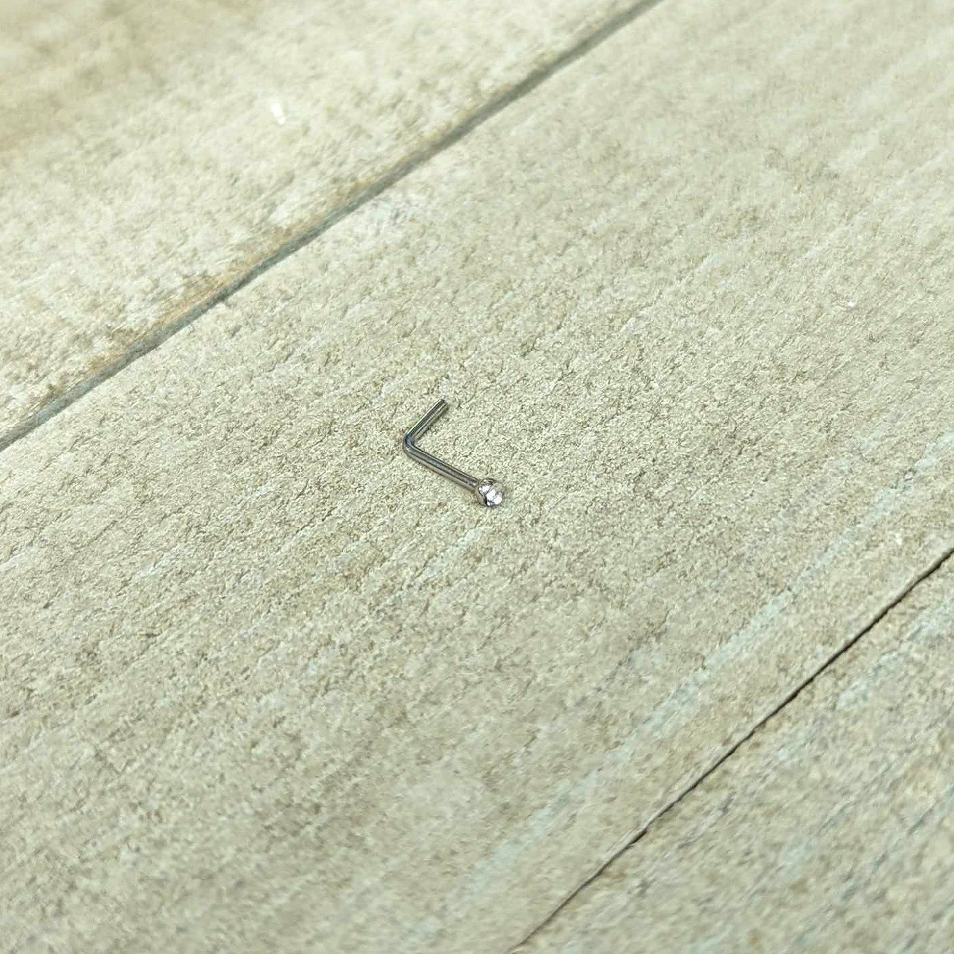 Clear gem nose piercing. Micro 1.57mm nose stud piercing with an l-shape. Sexy and discreet micro L-shape nose ring. Series 157 nose studs. Gem nose ring body jewelry made from 316L surgical steel.