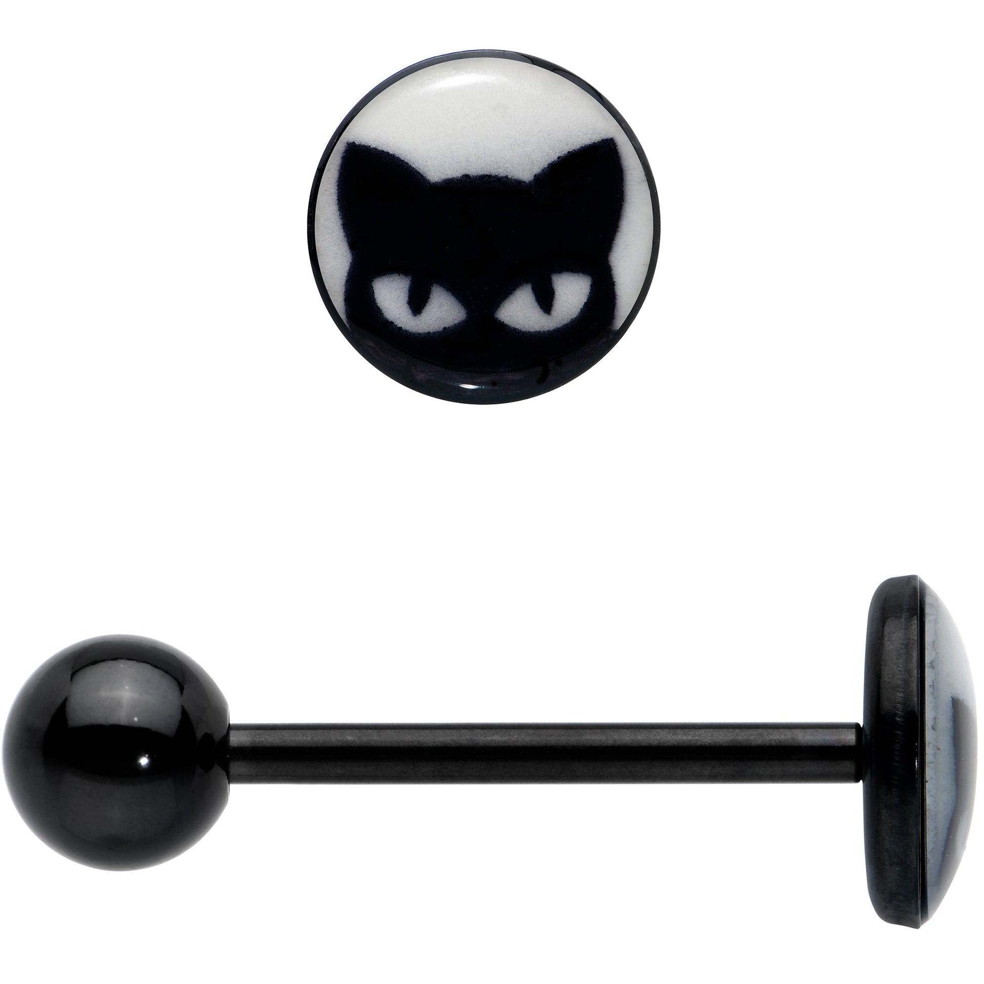 Peek-A-Boo! Have fun with this peeking cat tongue ring; perfect for any day even Halloween. This black cat tongue piercing features an anodized straight barbell and fun glow in the dark logo inlay.
