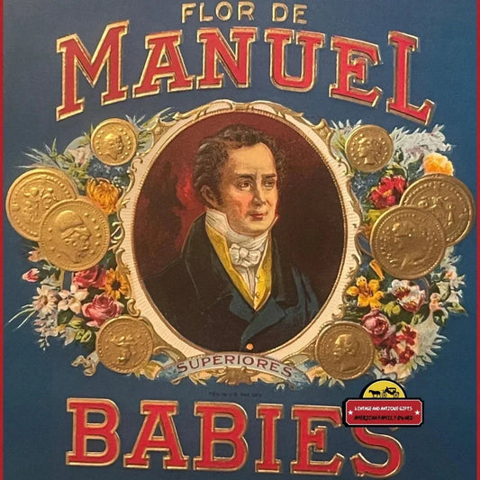 Antique Vintage 1900s - 1930s Flor De Manuel Babies Gold Embossed Cigar Label