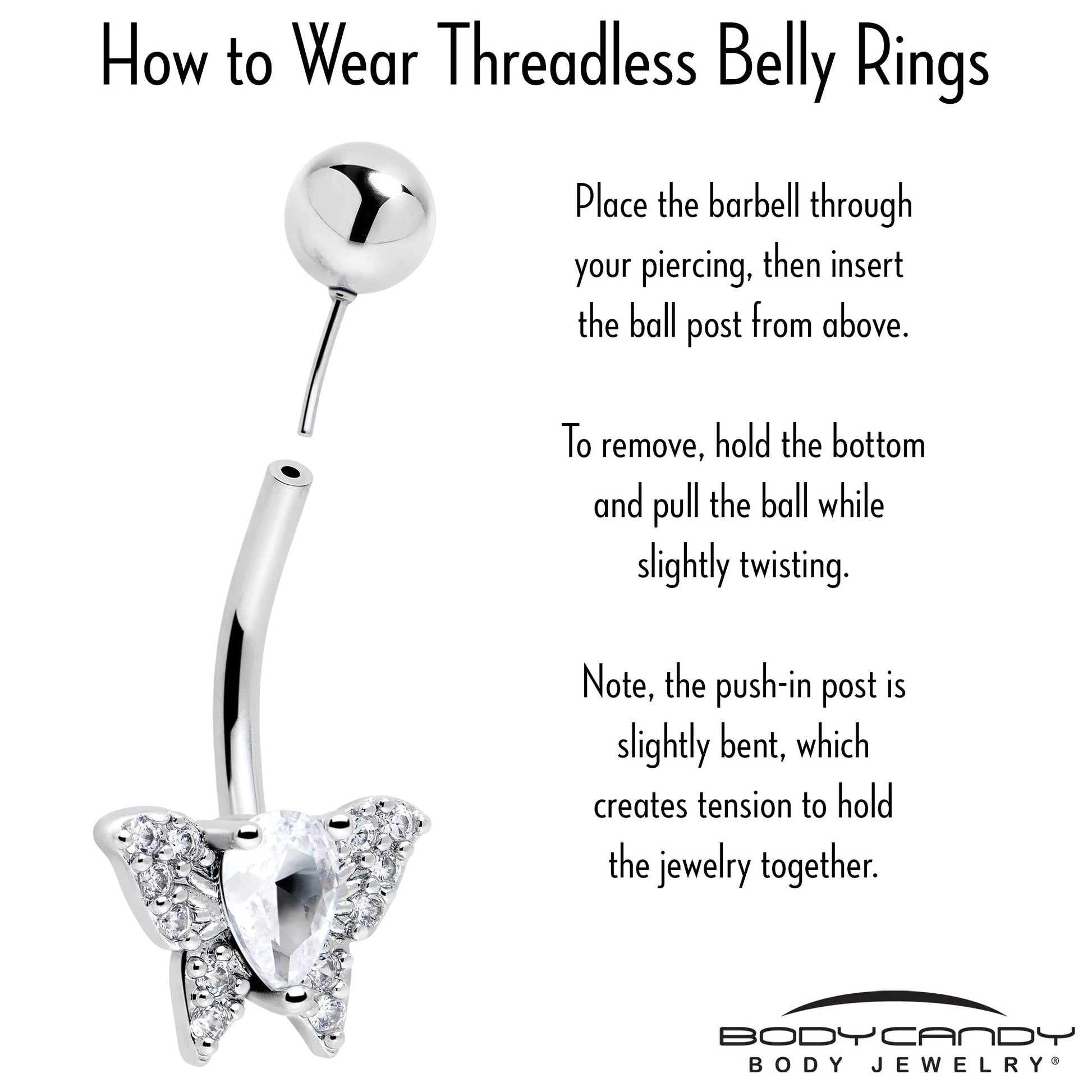 The butterfly on this 14 gauge navel ring will make you want to spread wings of style. It's made with a 3/8 inch 316L surgical grade stainless steel curved barbell with a 5mm top ball end. The bottom end features a butterfly charm, with wings set with cubic zirconia gems. The butterfly is further embellished with a matching cubic zirconia gem body for an ornate appearance. This opulent butterfly belly piercing jewelry will make you want to fly. Butterfly belly button ring.