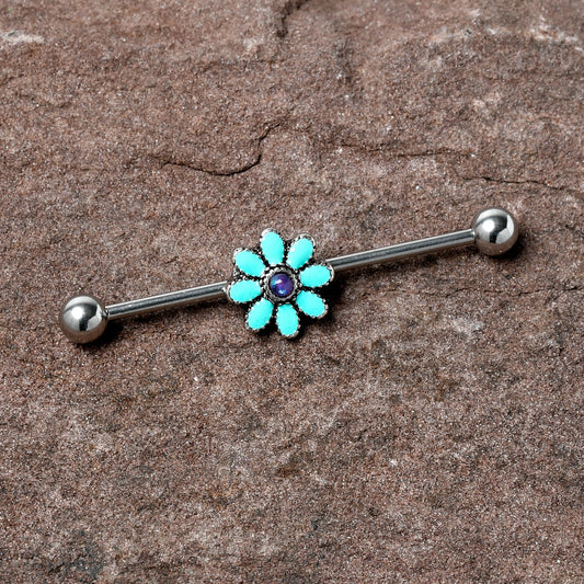 14G Blue Faux Opal Flower Teal Petals Industrial Barbell 38mm