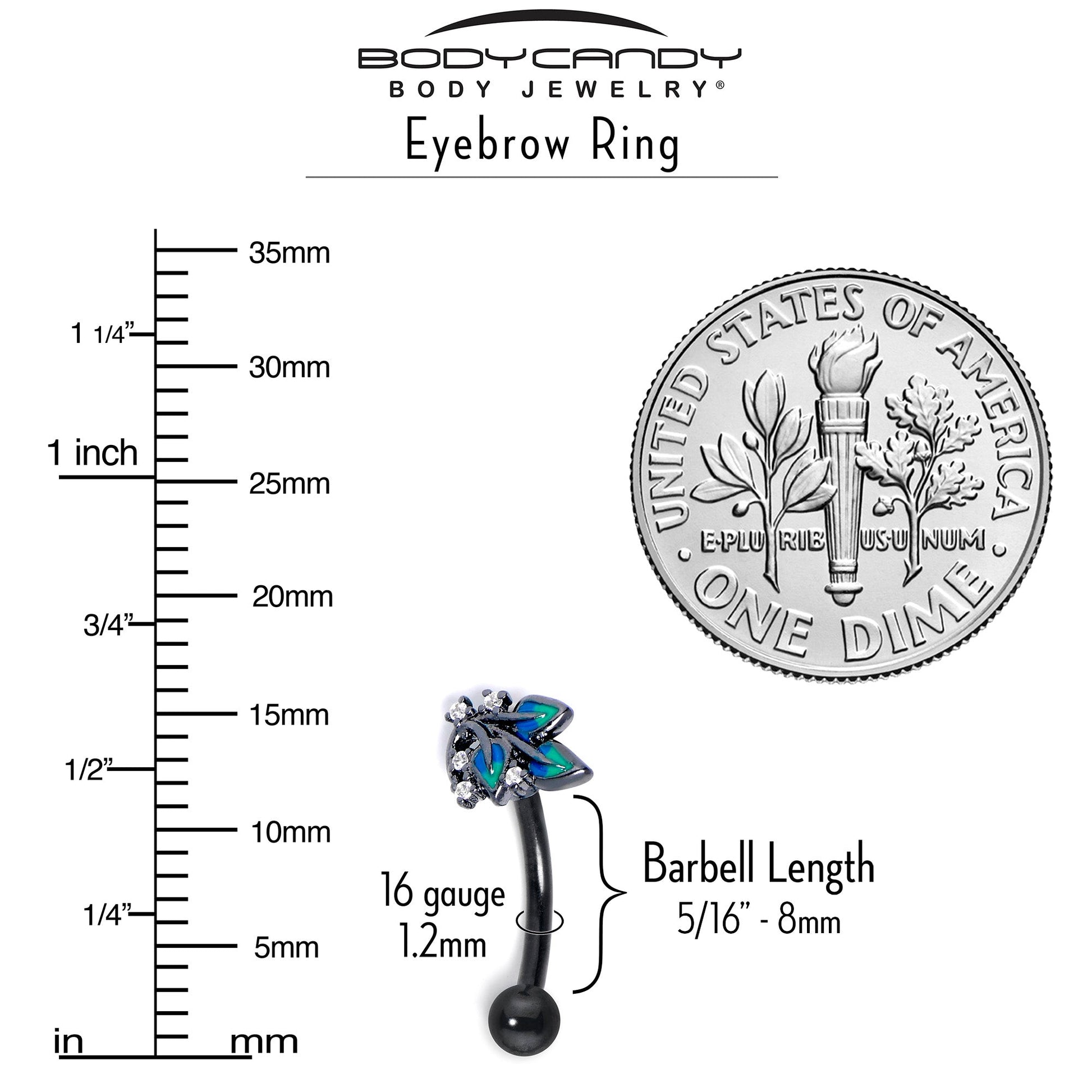 Get a lush, tropical look with this leafy 16 gauge eyebrow jewelry. It's made with an 8mm black PVD over 316L surgical grade stainless steel curved barbell with a 3mm bottom ball end. The top end features a a green and blue leaves charm, embellished with clear cubic zirconia gems. You can even rock it in multiple piercings including eyebrow, rook, and some daith piercings. You'll be looking luscious and lovely when you are rocking this tropically styled cartilage piercing ring.Specifications