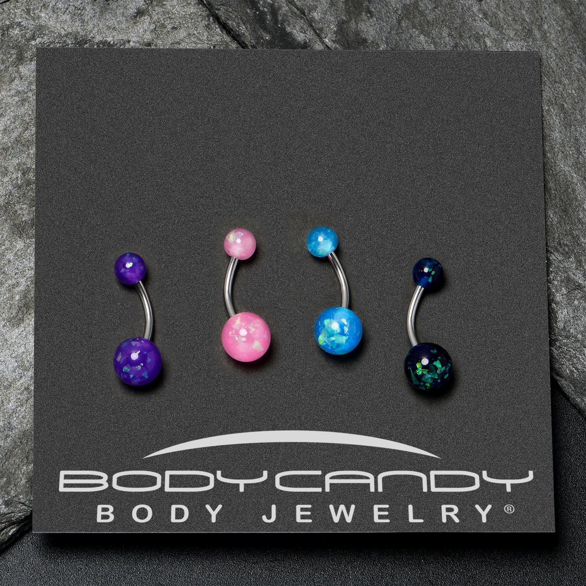 Simple colors can be simply stunning with these 14 gauge navel rings. They are made with 3/8 inch durable 316L surgical grade stainless steel curved barbell with 5mm top ball ends and 8mm bottom ball ends. The ball ends are faux opal and feature intense colors for a look that turns basic to beautiful. You get one each in pink, light blue, dark blue, and purple. Keep it basic without looking boring with these charming belly piercing rings. Sold as a set of four.Specifications