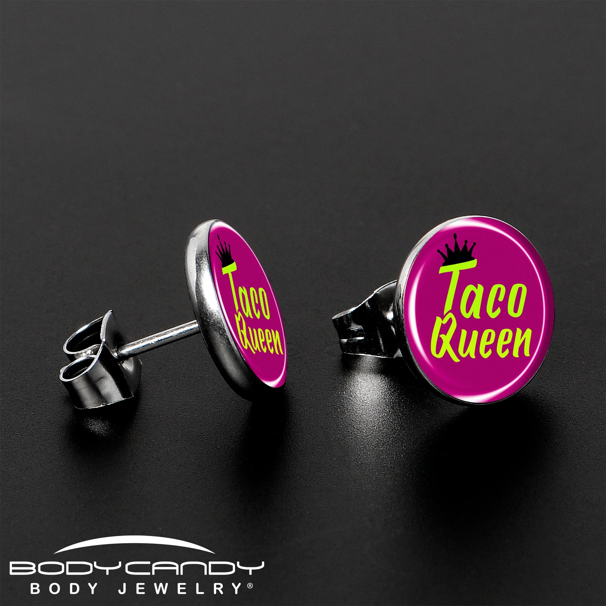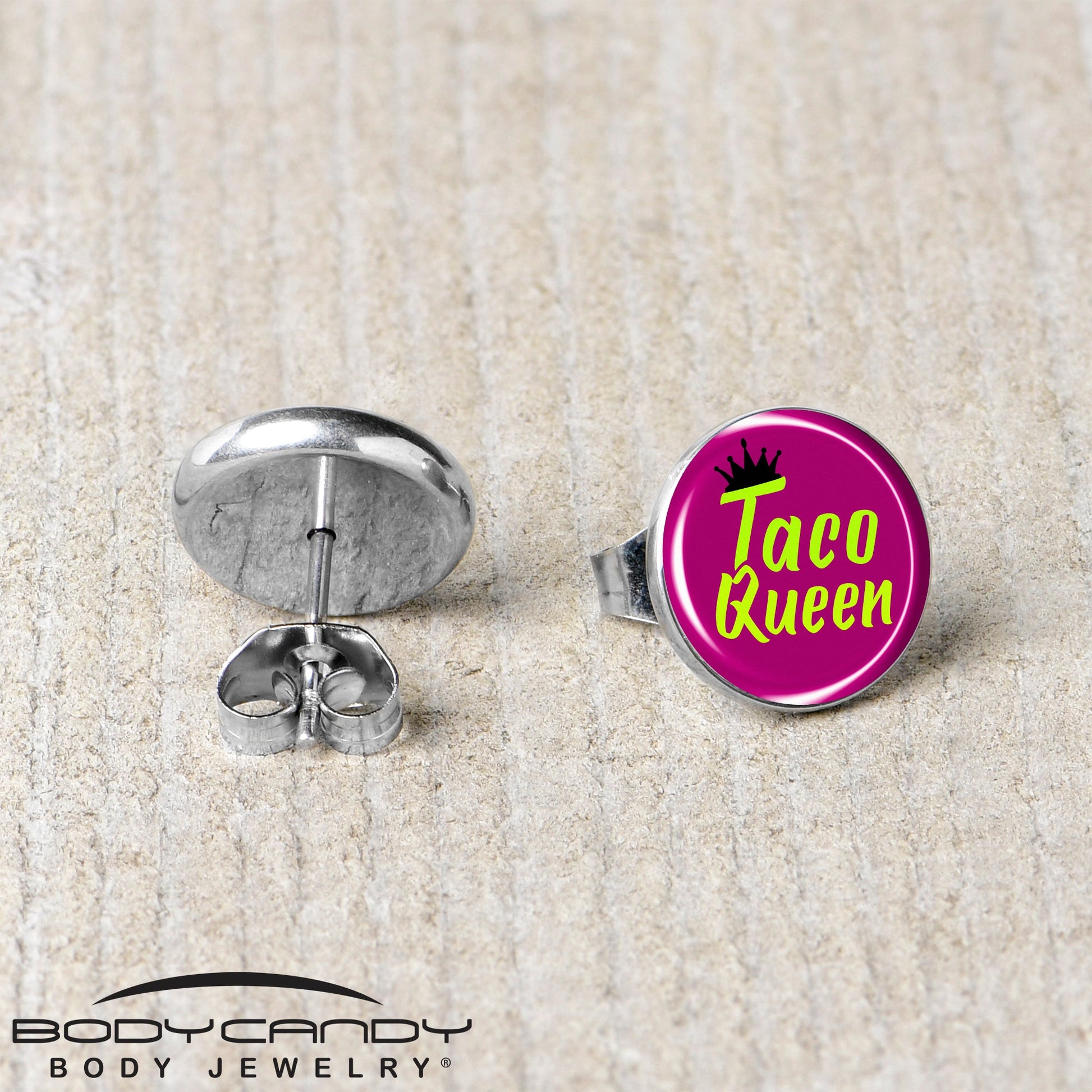 Whether it's making them or eating them, you are taco royalty so tell the world with these stud earrings for pierced lobes. These taco queen earrings are made with stainless steel straight posts with friction backs for a secure fit. They feature artist original, hand drawn logos and are even hypoallergenic. What more could you want besides maybe a taco to go with these humorous taco queen pierced earrings. Sold as a set of two.