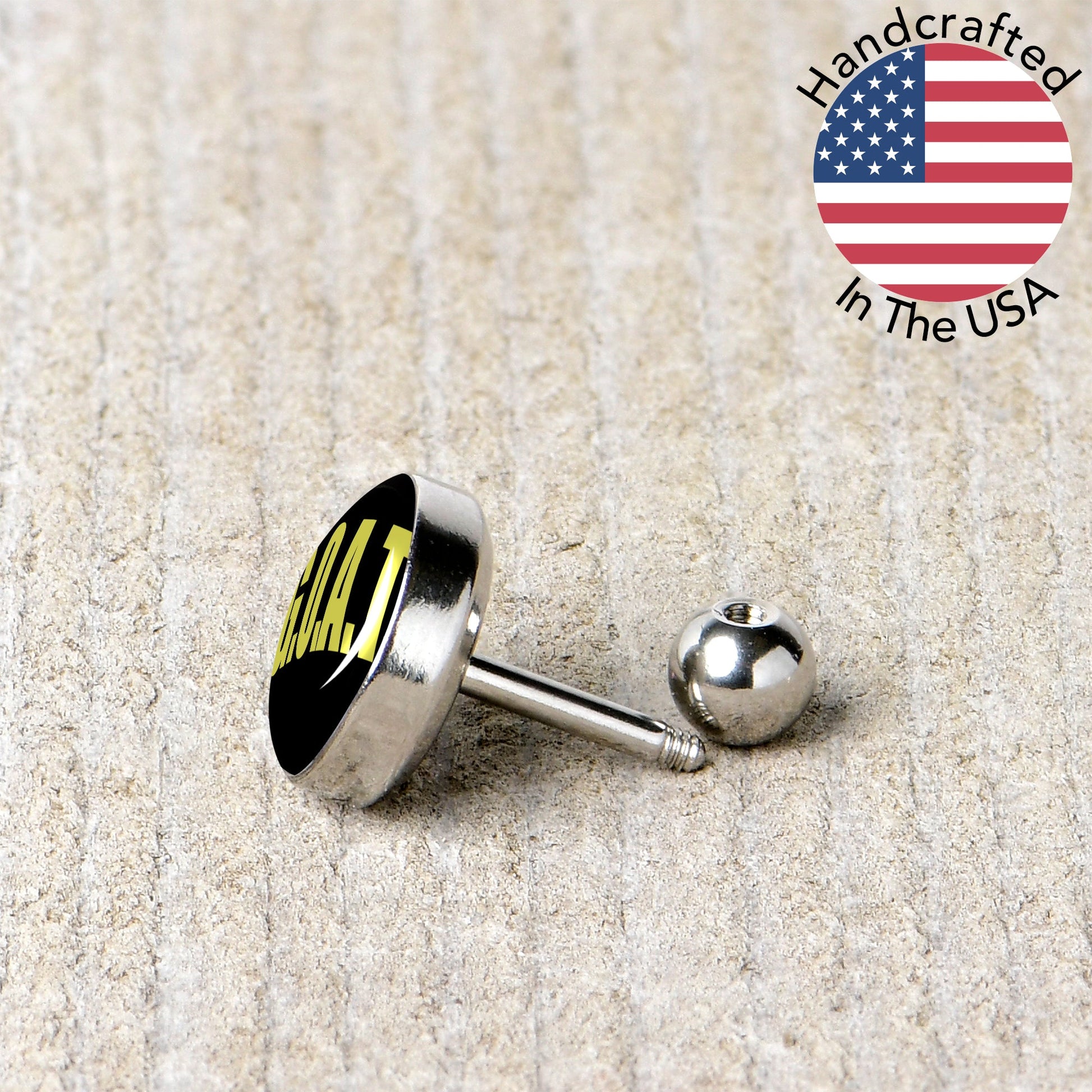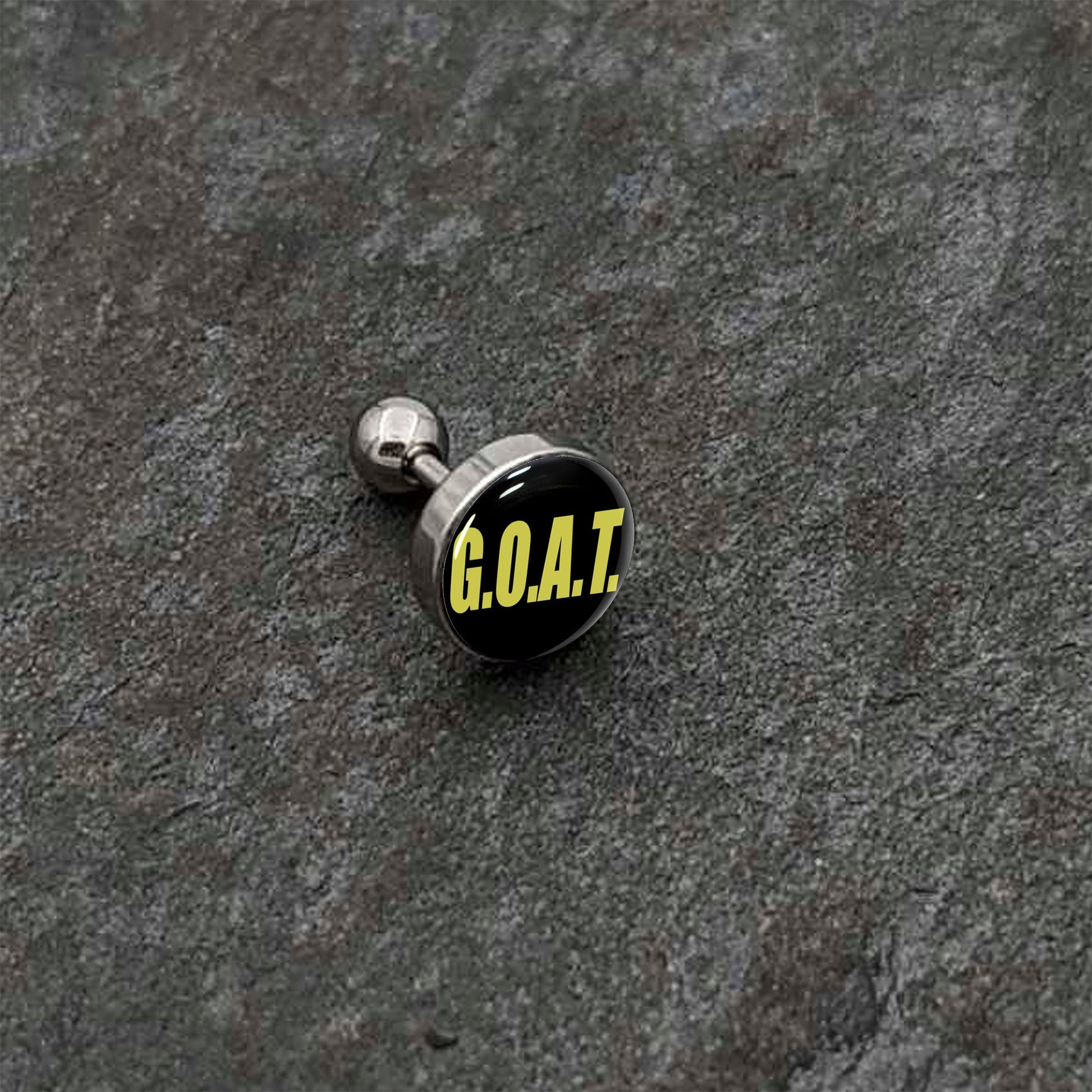 You are the greatest and you know it, so show it with this 16 gauge tragus stud. It is made with a 6mm durable 316L surgical grade stainless steel straight barbell with a 4mm ball end. The front end features a disc shaped charm with a black background. It has the acronym for Greatest of All Time on it in yellow, for maximum visibility and you can rock it in multiple piercings including tragus, helix, and some conch piercings. You will have the greatest helix jewelry of all time to match your own awesome self with this bold cartilage piercing ring.