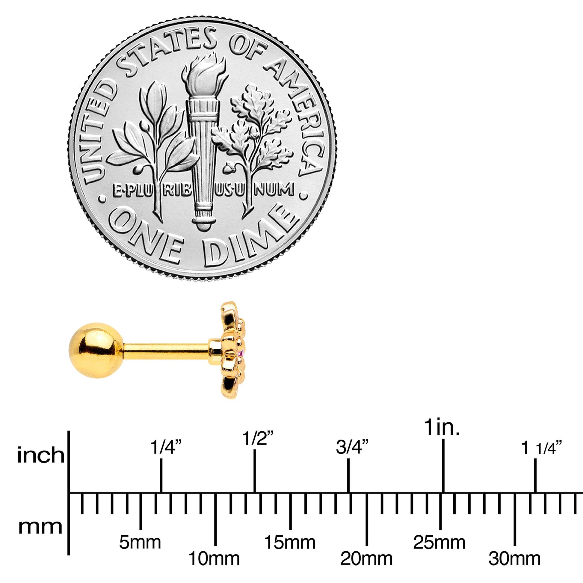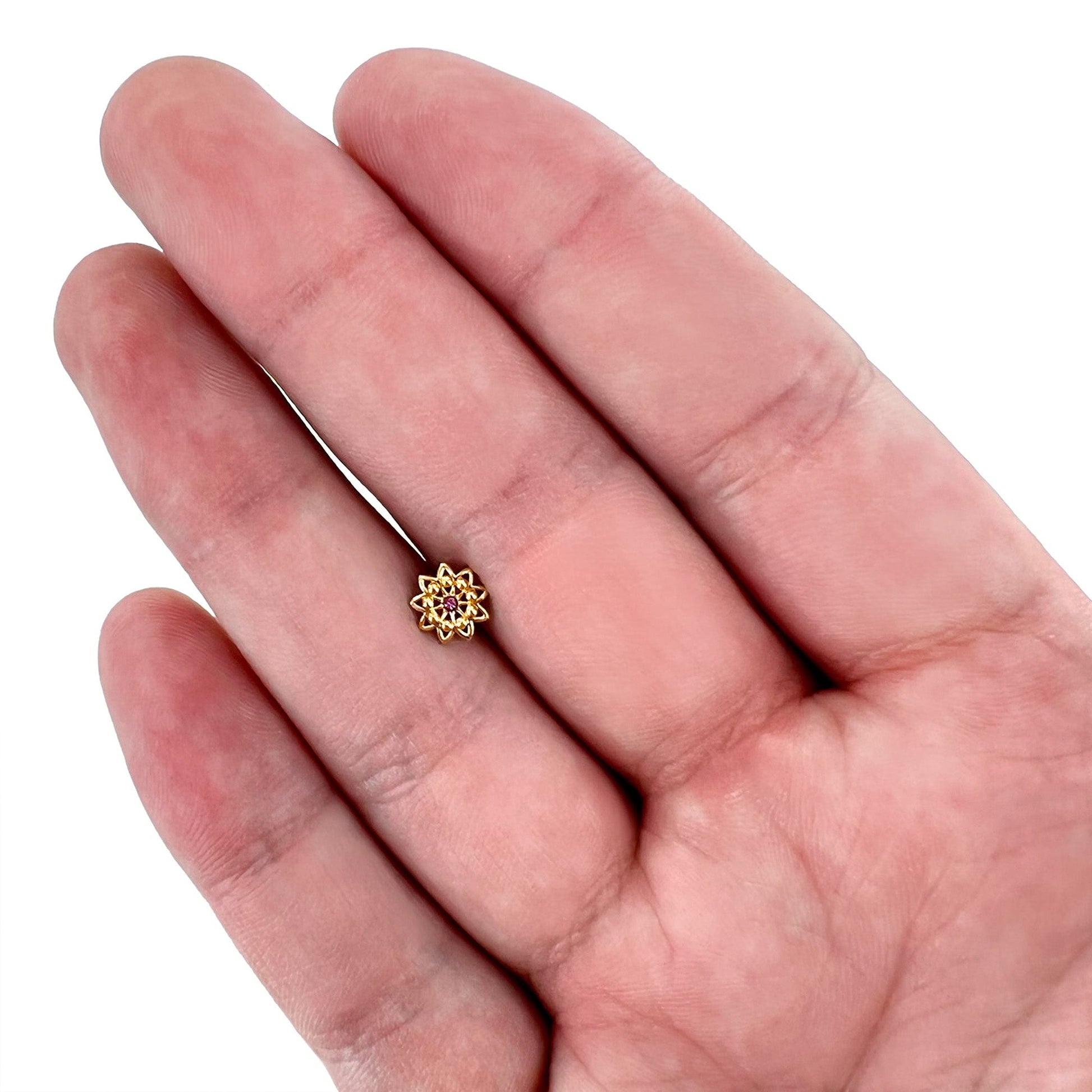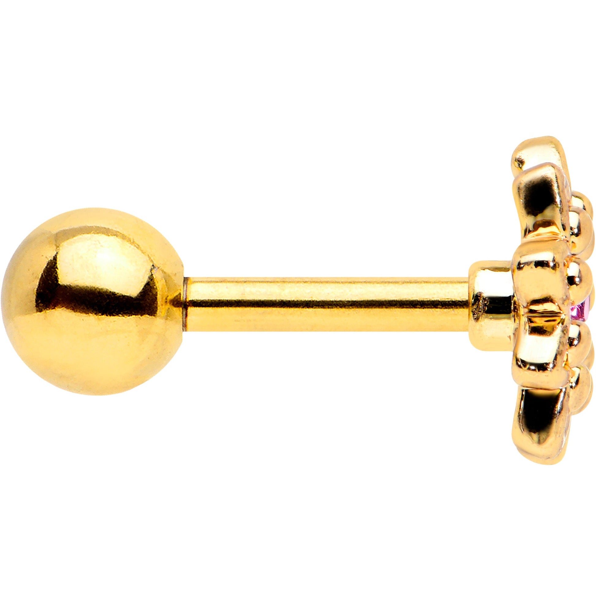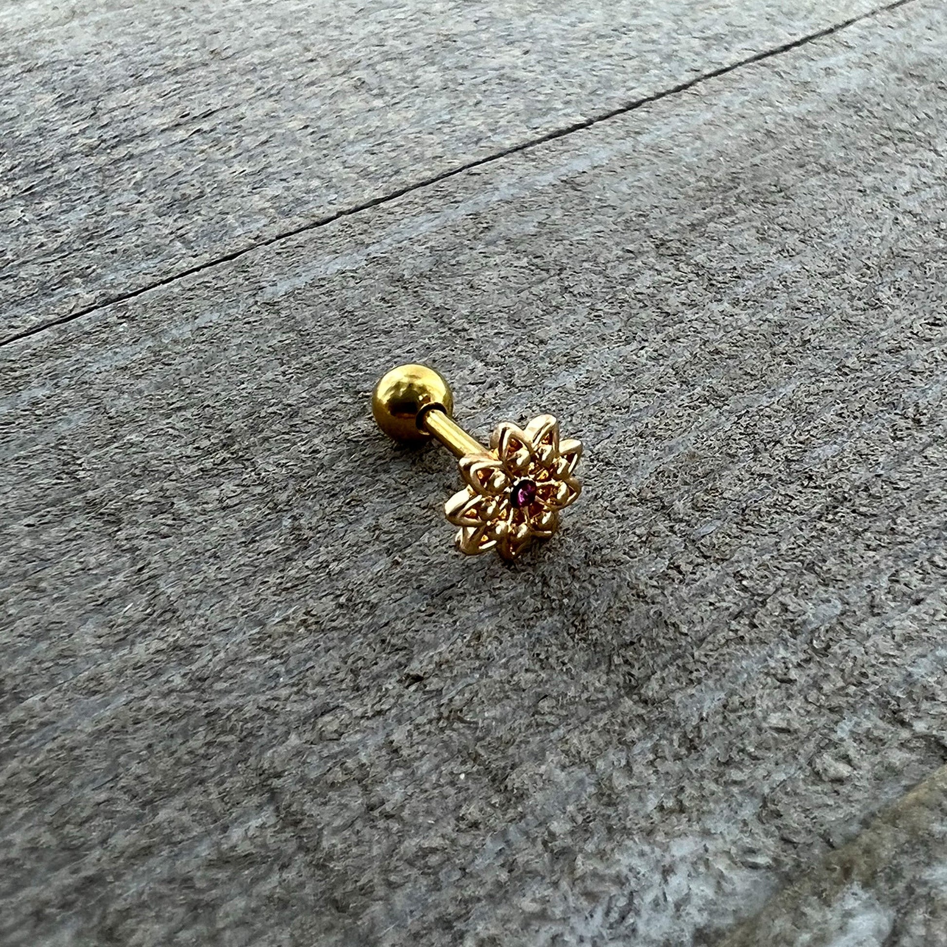 Some flowers are meant to be stars, like this 16 gauge tragus stud! It's made with a 6mm gold tone PVD over 316L surgical grade stainless steel straight barbell with a 4mm ball end. It features a detailed flower charm, with textured petals and the flower is set at the center with a pink gem for stunning color contrast. You can even flaunt this flower in multiple piercings including tragus, helix, and some conch piercings. Let your piercings bloom like the stars they are when you're rocking this striking starry flower cartilage stud.Specifications