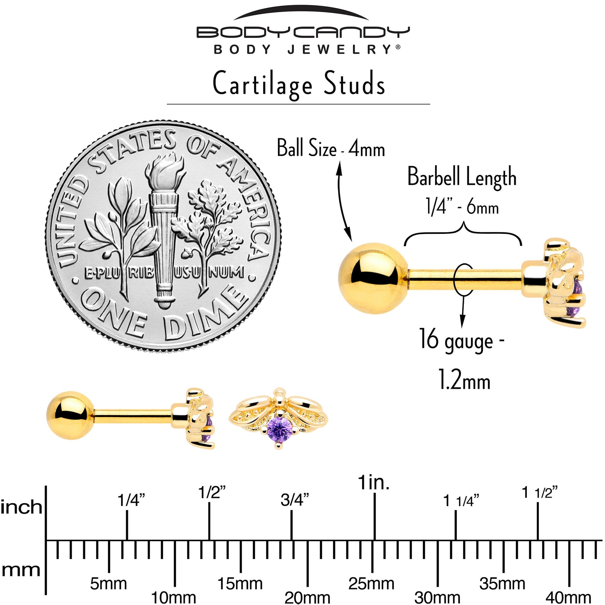 This 16 gauge tragus stud is sure to give you one honey of a new look. It's made with a 6mm gold tone PVD over 316L surgical grade stainless steel straight barbell with a 4mm ball end. It features an insect charm, with the body composed of a single large purple gem. It also features stylized wings for a realistic and airy appearance and you can rock it in multiple piercings including tragus, helix, and some conch piercings. This unconventional insect cartilage piercing jewelry is sure going to make you look super sweet.