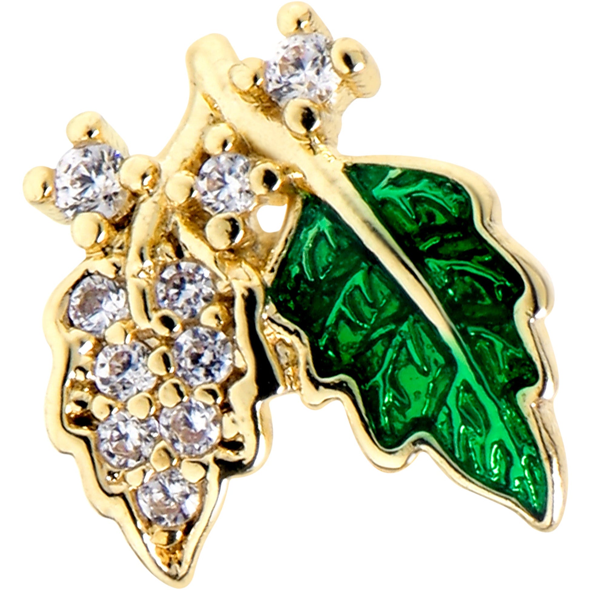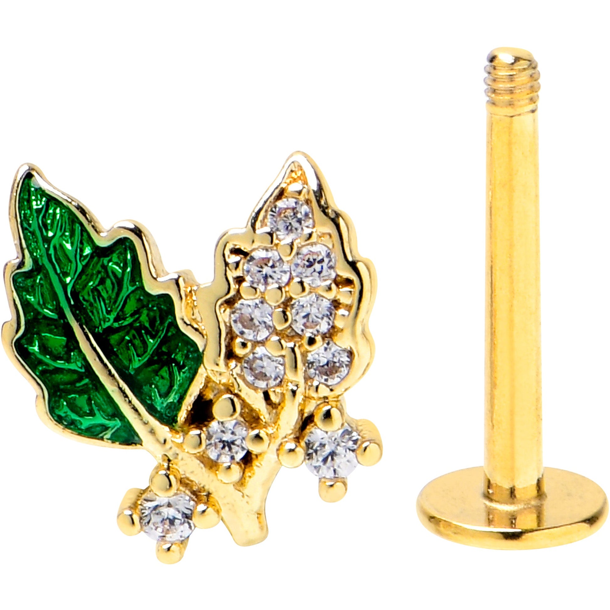 Here is a bit of nature you will never leaf behind when you rock this 16 gauge lip ring. It is made with an 8mm gold tone PVD over 316L surgical grade stainless steel straight post with a flat disc end. It features a leaves charm, with one set with deep green inlay and one paved with clear cubic zirconia gems. It also features clear cubic zirconia gem embellishment along the stems and you can rock it in multiple piercings including lip, monroe, tragus, helix, and some conch piercings. Get your nature on with this awesome, arboreal cartilage piercing jewelry.