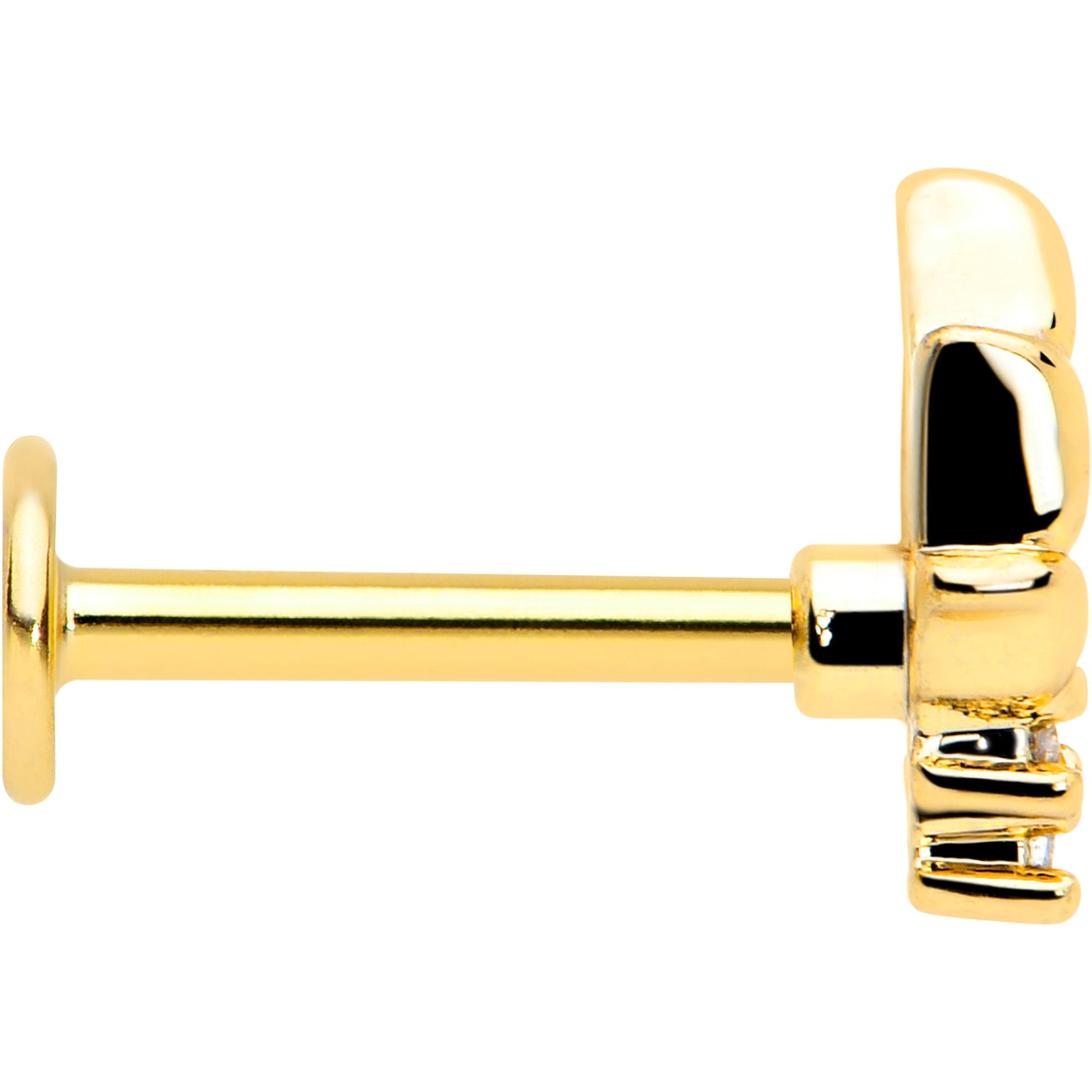 Light a fire of fashion with this 16 gauge lip ring. It's made with an 8mm gold tone PVD over 316L surgical grade stainless steel straight post with a flat disc end. It features a flame charm with the bottom embellished with clear cubic zirconia gems. The flame's center is set with a pink cubic zirconia gem for huge color impact and you can rock it in multiple piercings including lip, monroe, tragus, helix, and some conch piercings. You'll be burning with glamour when you're rocking this elegant cartilage piercing jewelry.