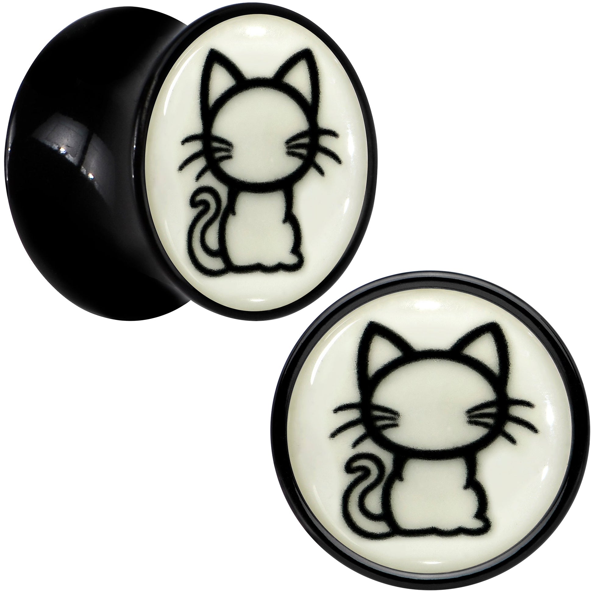 Get your glow on and look like the cat's pajamas with these plug earrings for stretched lobes. They're made with black acrylic and feature a saddle design for comfortable insertion and removal. Each one features a cat charm. The cats feature simple black detailing for visual impact and when you turn down the lights, they glow in the dark. You'll be positively glowing with these classic kitty cat ear gauges. Sold as a set of two. Available in Sizes 8mm to 20mm.
