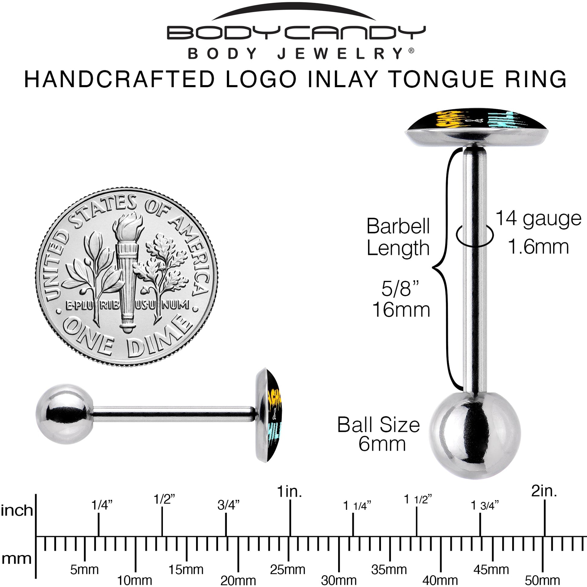 What could be a tastier combination than the one on this 14 gauge tongue jewelry? It's made with a 5/8 inch 316L surgical grade stainless steel straight barbell with a 6mm bottom ball end. The top end features an original, artist hand drawn logo describing the single best way to spend an evening and it's even hypoallergenic. Get comfy and get delicious with the original design on this tongue piercing ring that proclaims nachos & chill.