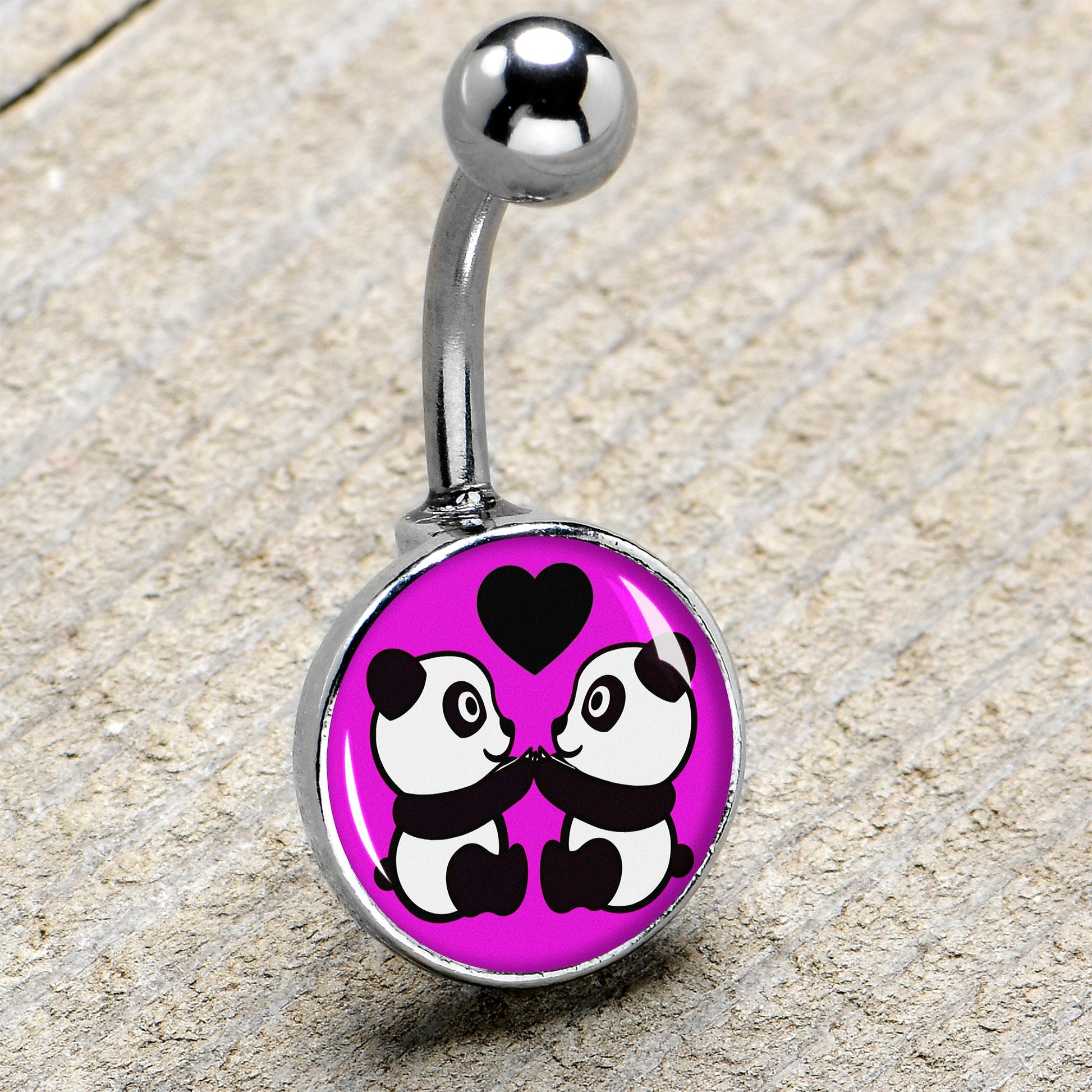 You will fall in love too with the happy panda bears on this 14 gauge navel ring. It is made with a 7/16 inch 316L surgical grade stainless steel curved barbell with a 5mm top ball end. The bottom end features a purple disc charm. It features a pair of pandas, gazing lovingly at each other, with a heart above and between them. Love is for everyone when it comes to this pleasing panda belly piercing ring.