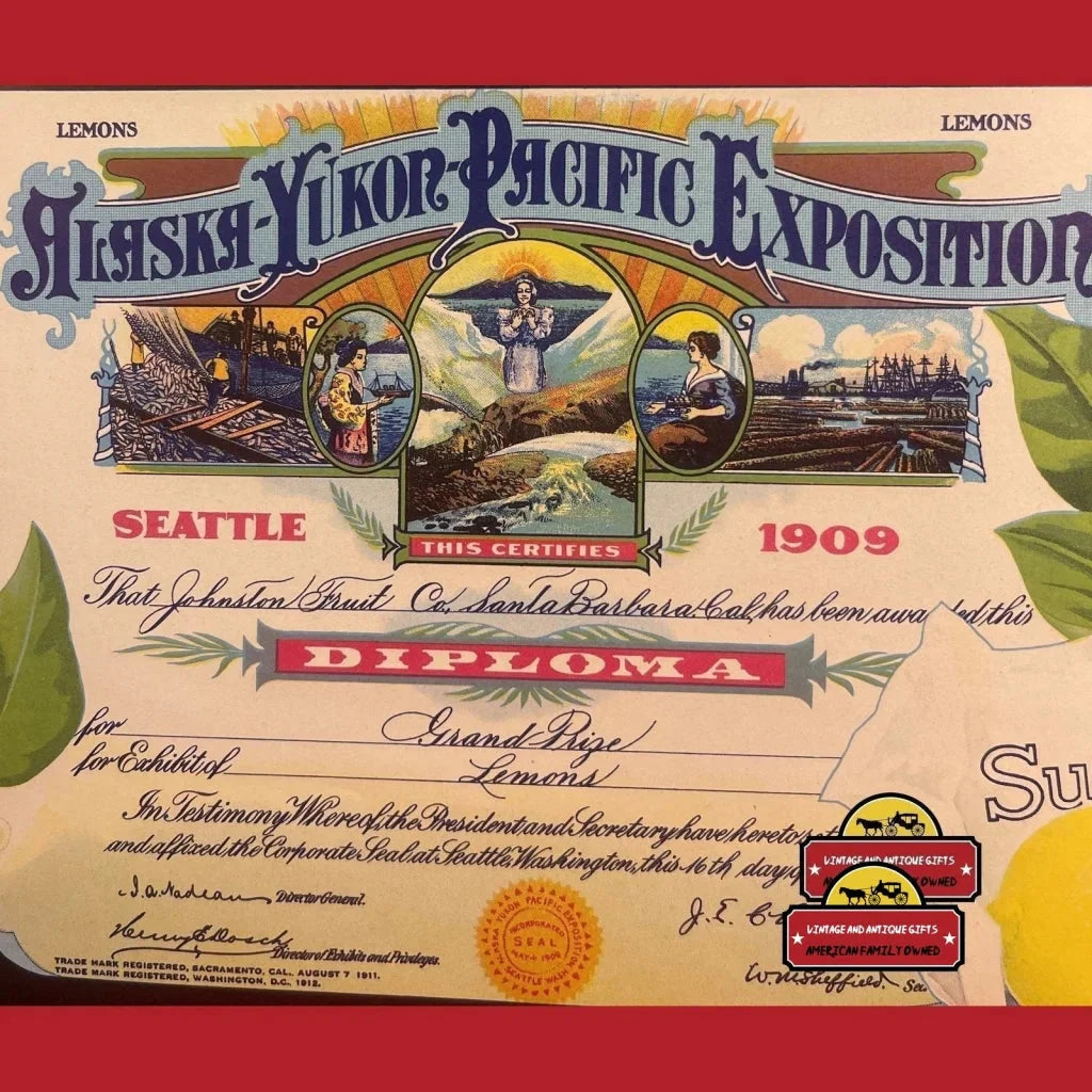 This exquisite crate label was produced in the 1930s by Johnstone Fruit Company of Santa Barbara, California. It celebrates the company’s award at the Alaska–Yukon–Pacific Exposition of 1909, where they won the grand prize for their exhibit of lemons at the 1909 fair.