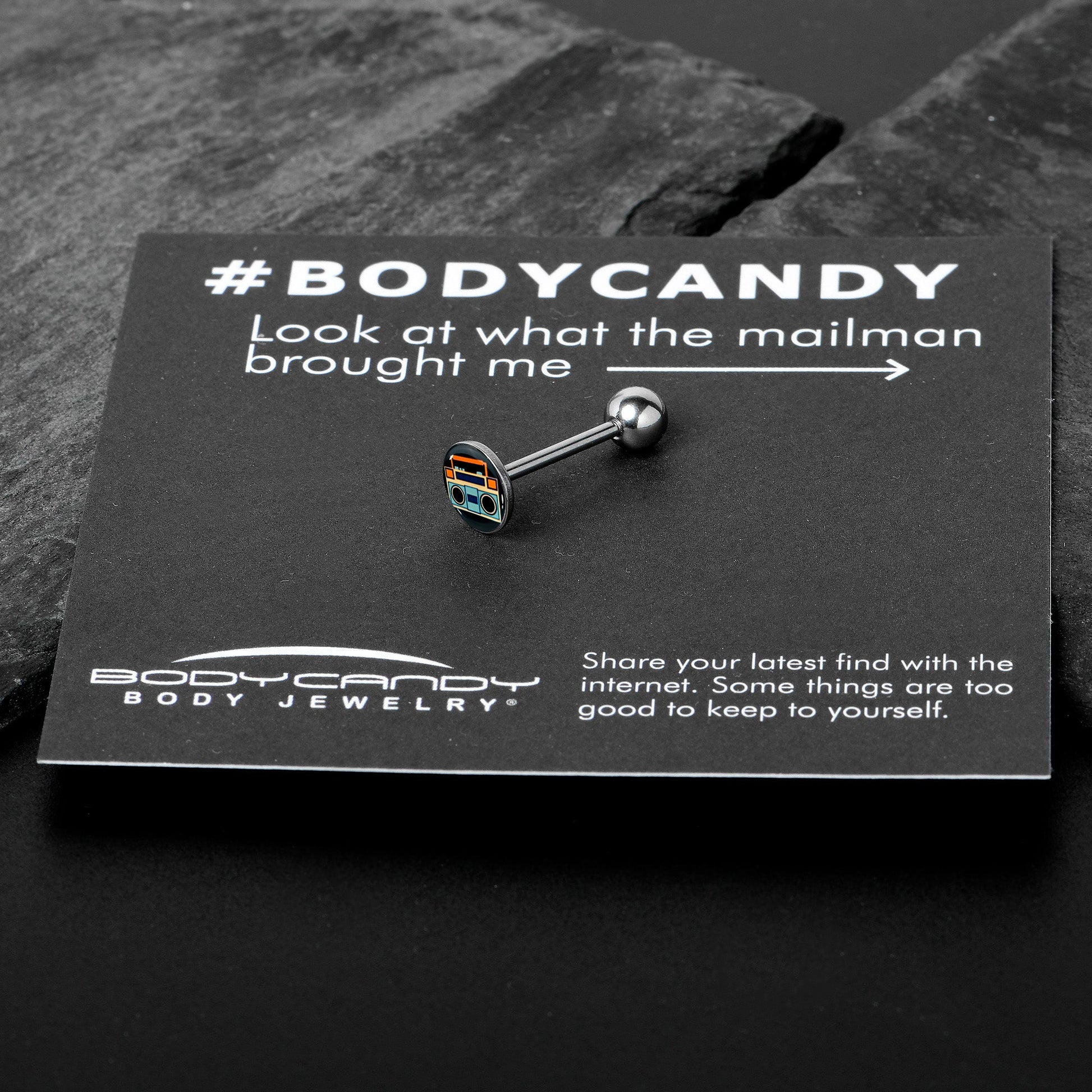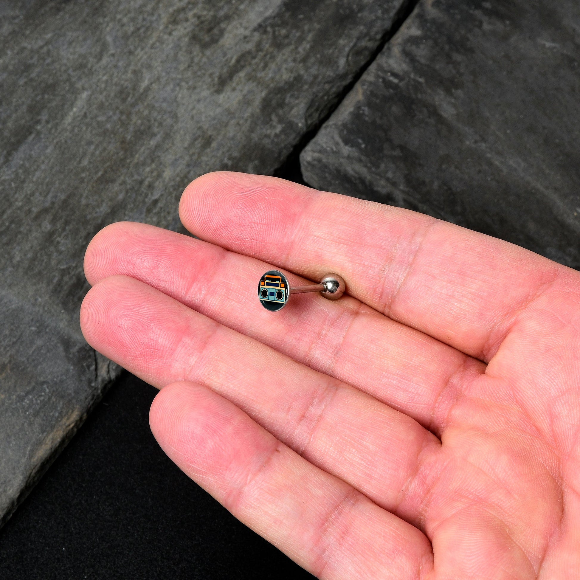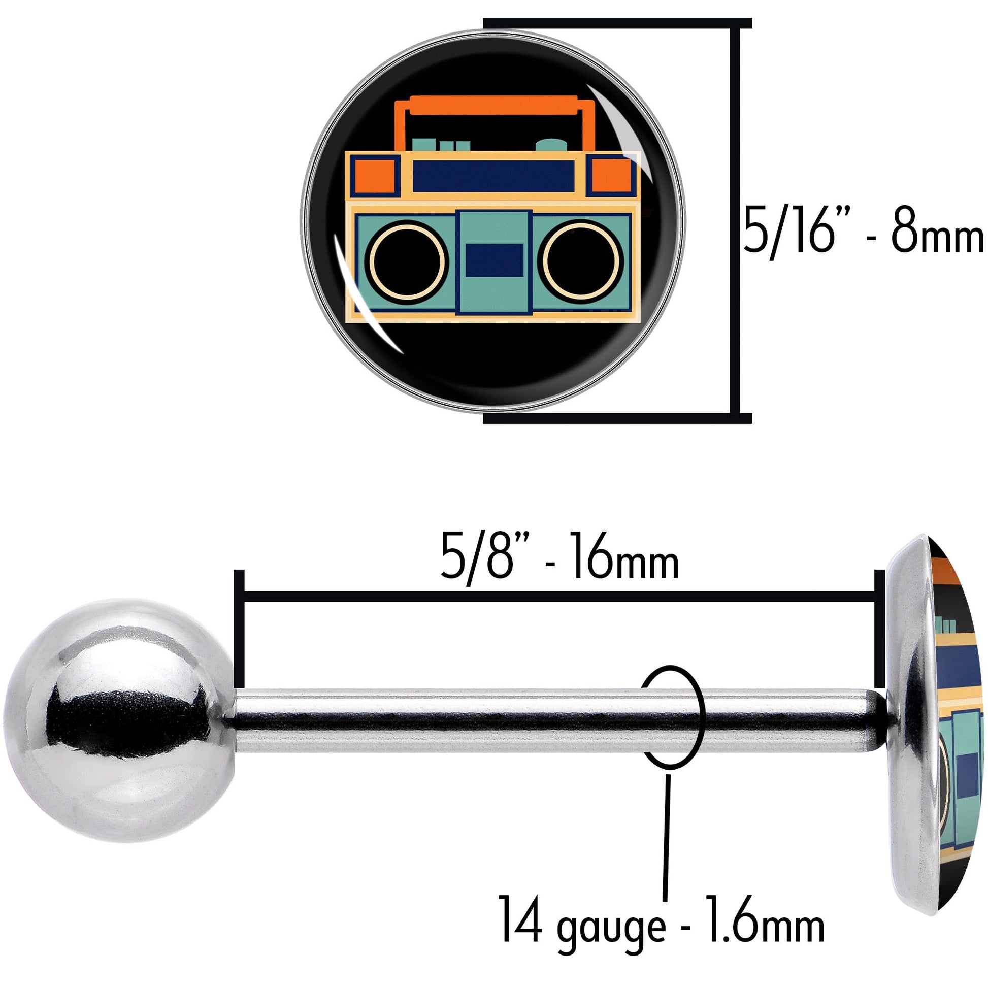 Pump up the jams with this 14 gauge tongue jewelry! It's made with a 5/8" durable 316L surgical grade stainless steel straight barbell with a 5mm bottom ball end. The disc shaped top end features an 80's style boombox charm. The boom box is blue with orange detailing for visual contrast you can't help but notice. Rock out your piercings old-school with this refreshingly retro tongue piercing ring!