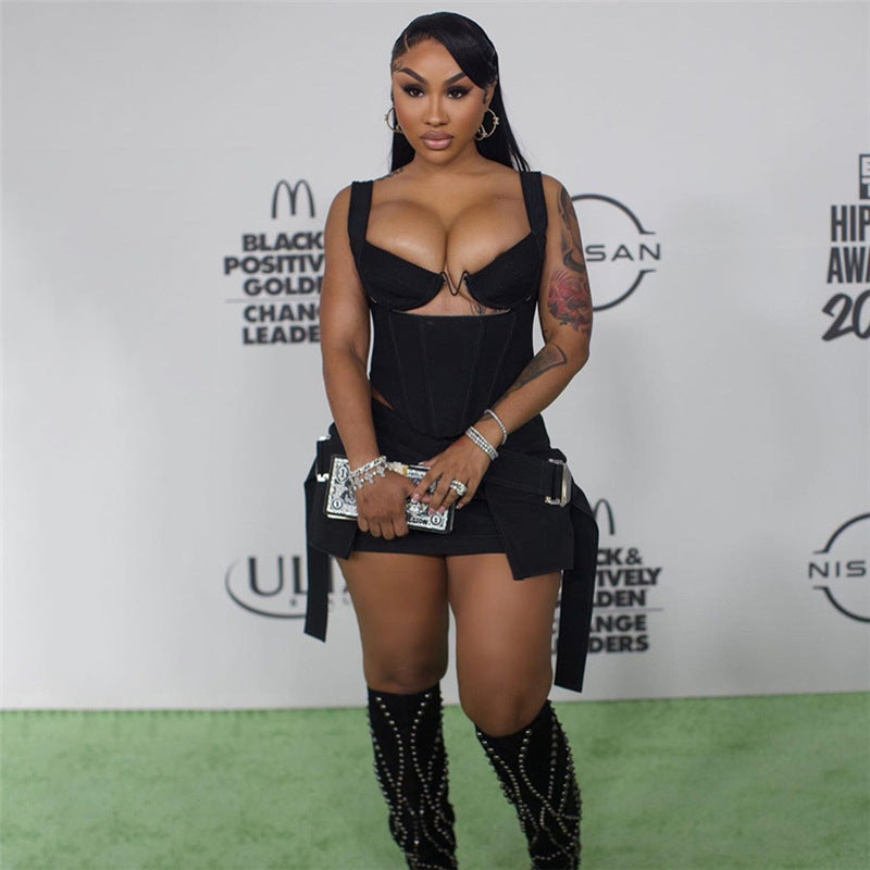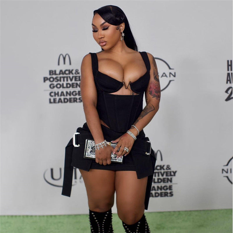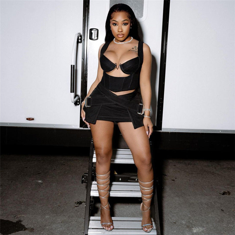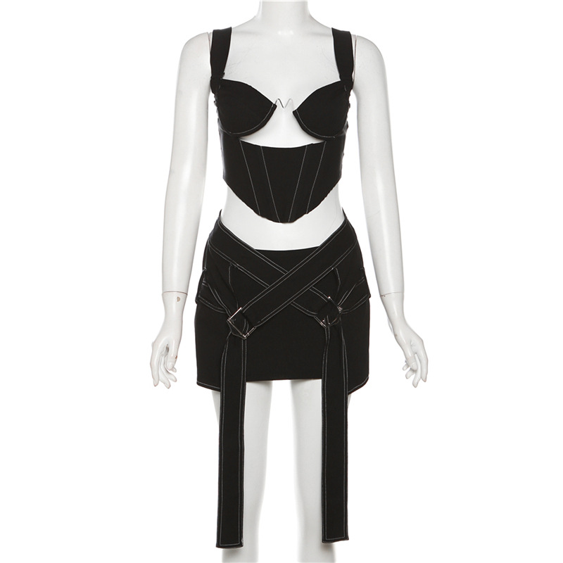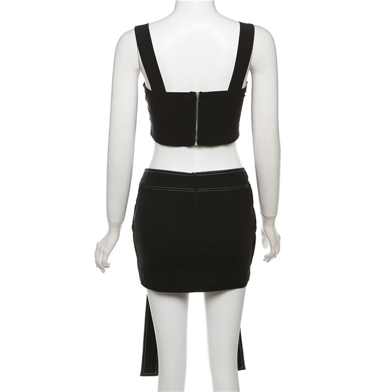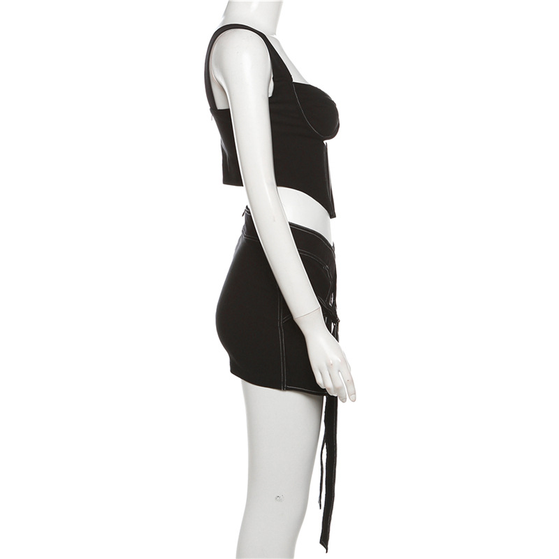 Spring Women Clothes Solid Color Stitching Vest Top High Waist Hip Slim Fit Skirt Set
