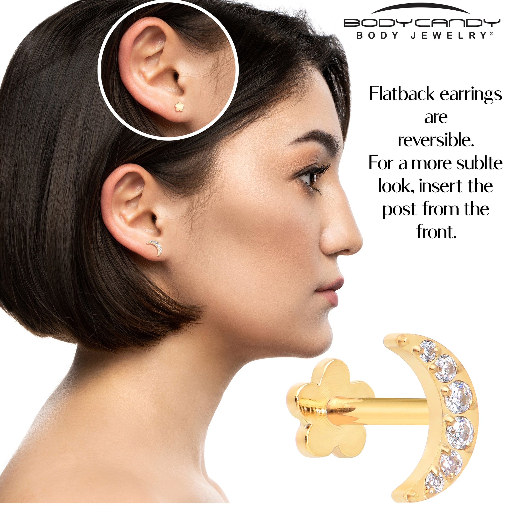 Titanium Flat Back Earring Gem Crescent Moon - 18G Threadless Reversible
