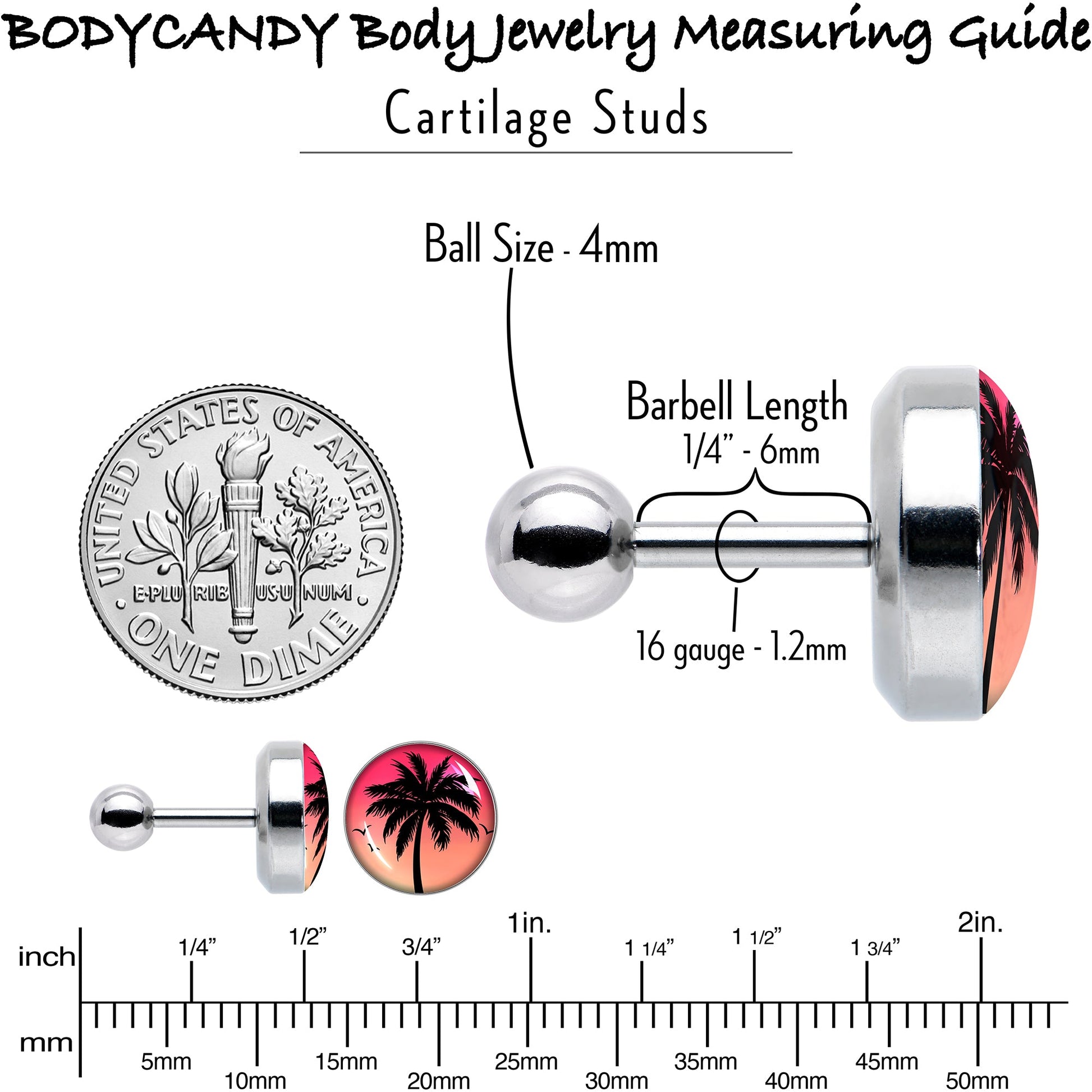 Have a hot night in the tropics from anywhere, at any time, with this 16 gauge palm tree tragus stud. It is made with a 6mm durable 316L surgical grade stainless steel straight barbell with a 4mm ball end. It features a silhouetted palm tree charm with birds against a sky that is all rich reds and sunset orange. You can even rock it in multiple piercings including tragus, helix, and some conch piercings. You will practically feel the ocean breeze when you are rocking this tropical sunset palm tree cartilage piercing ring.
