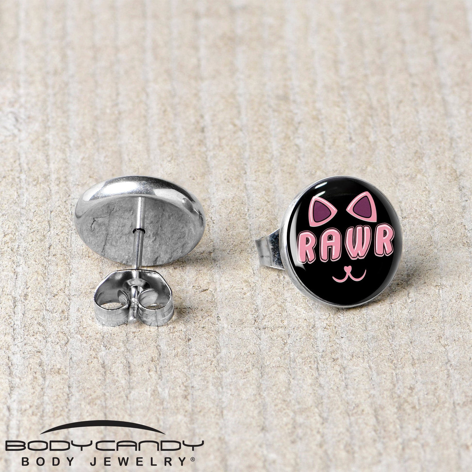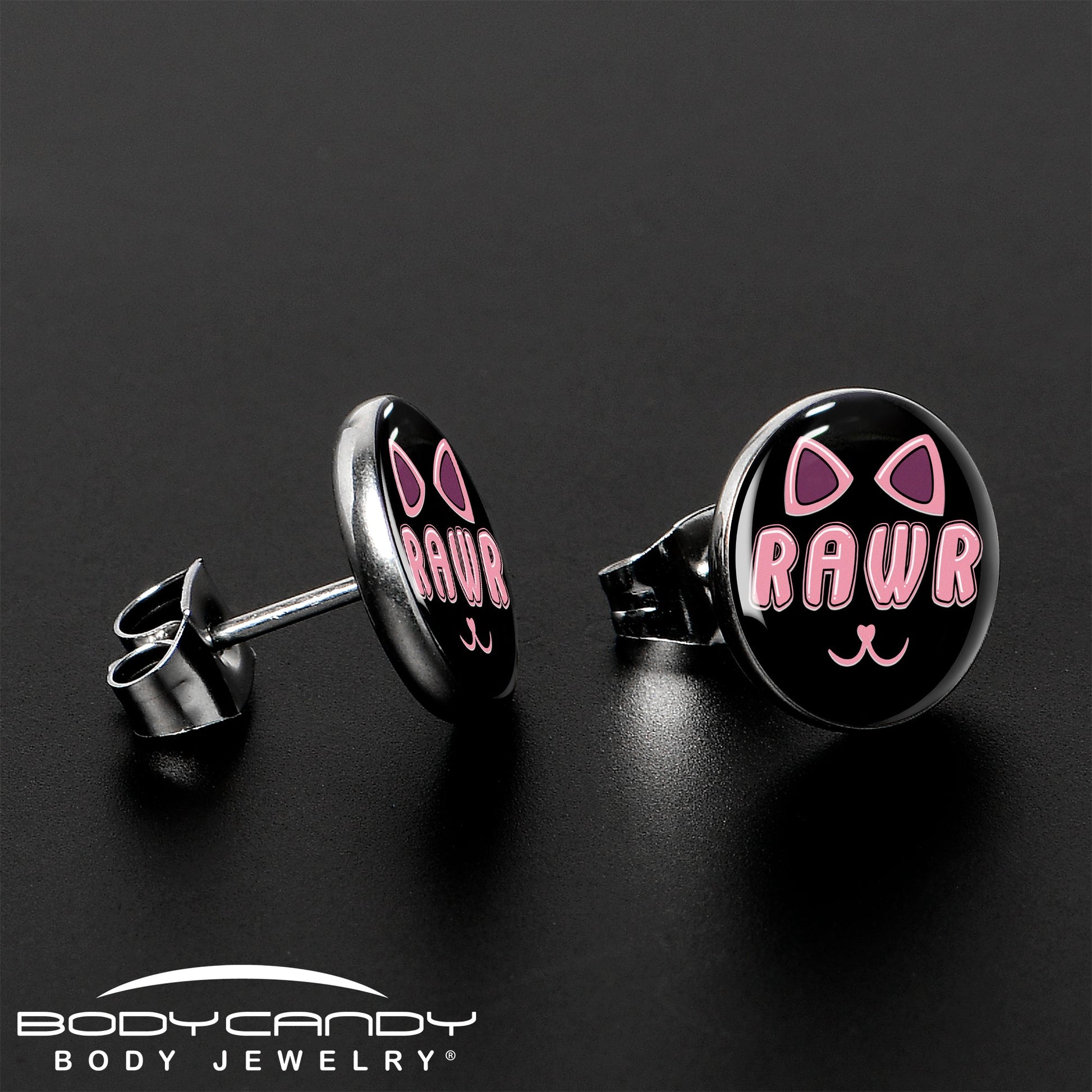 Hypoallergenic jewelry for sensitive skin.RAWR Kitty Cat Stud Earrings