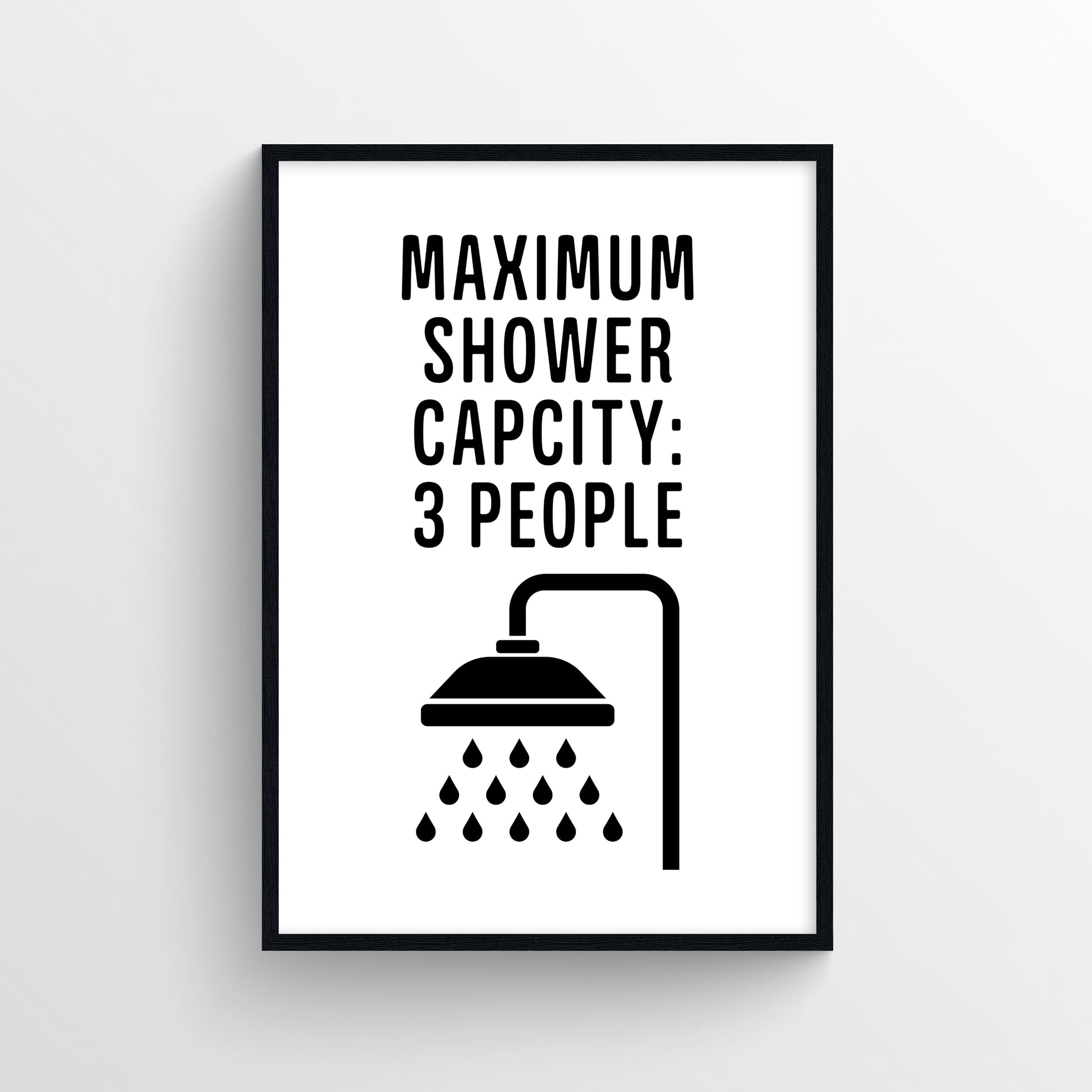 Reads “Maximum Shower Capacity: 3 People” with a bold showerhead icon dripping water beneath — hilariously suggestive and dorm-approved.