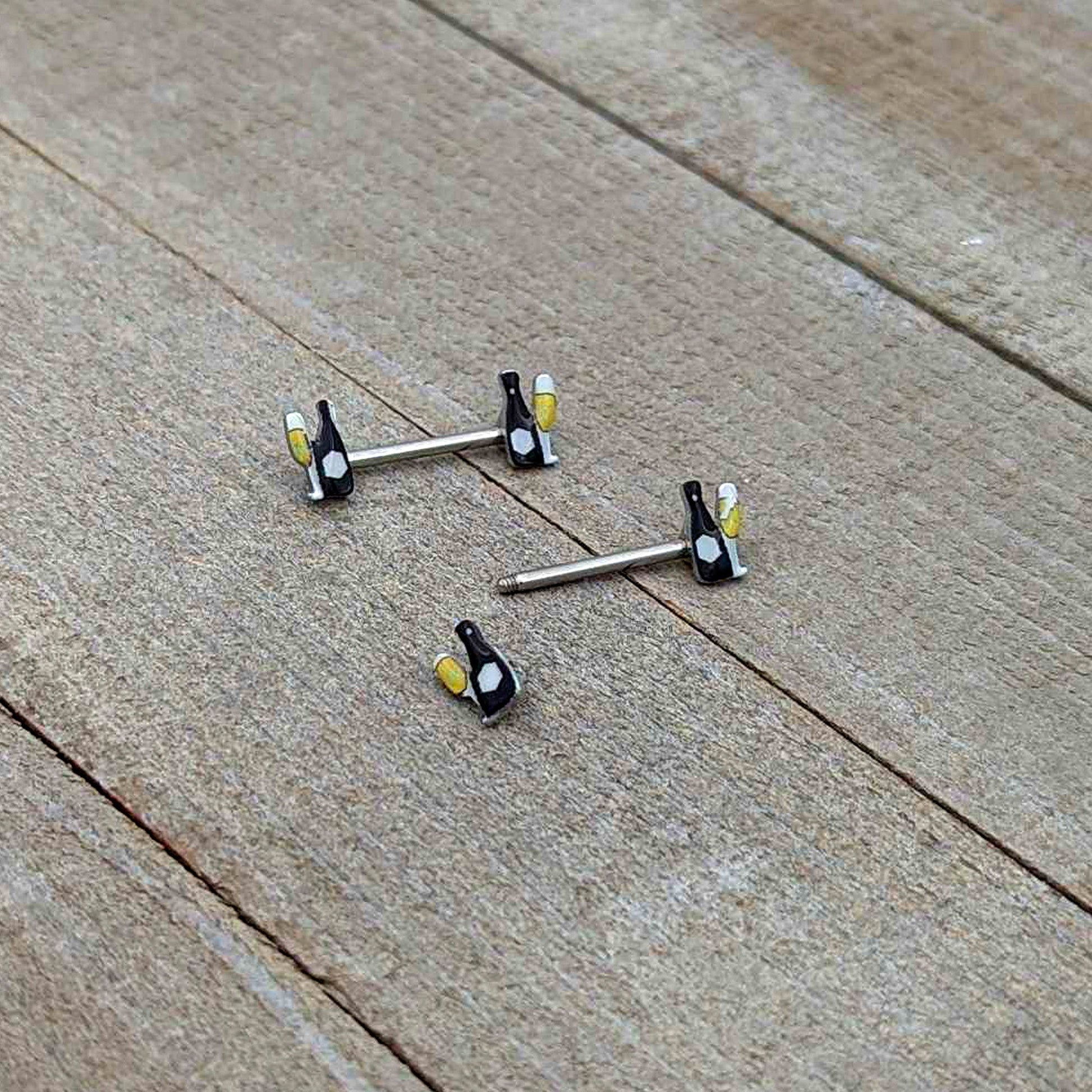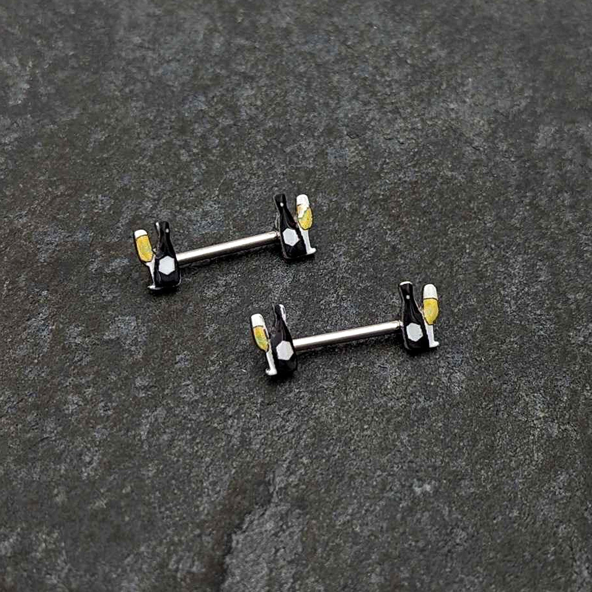 Pop the cork and ring in the new year with this elegantly styled 14 gauge nipple jewelry! It's made with 14mm durable 316L surgical grade stainless steel straight barbells. Each of the ends features a champagne charm, with the bottles inlaid in black with a grey label. Next to the bottles are matching champagne flutes with yellow inlaid bodies and bubble-inspired embellishments. You'll be ready to party when you're rocking these champagne themed nipple piercing rings! Sold as a set of two.