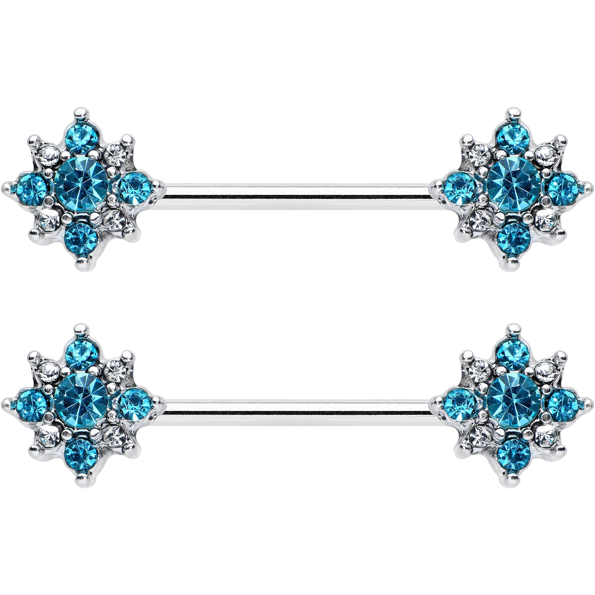 14G 9/16 Clear Blue Gem Opulent Flower Barbell Nipple Ring Set