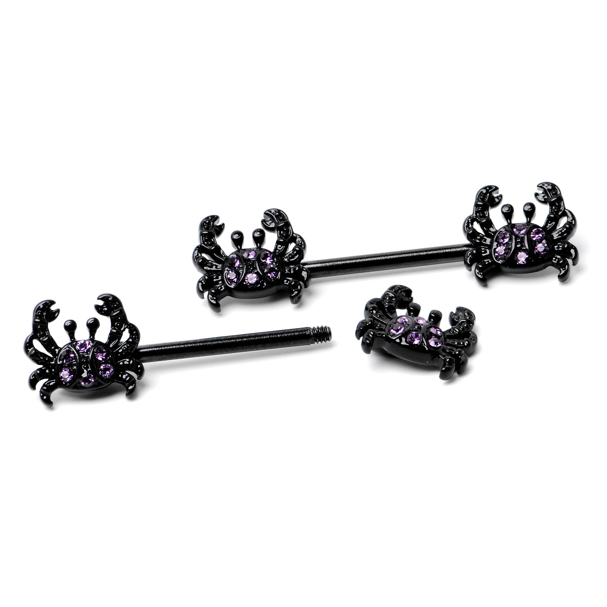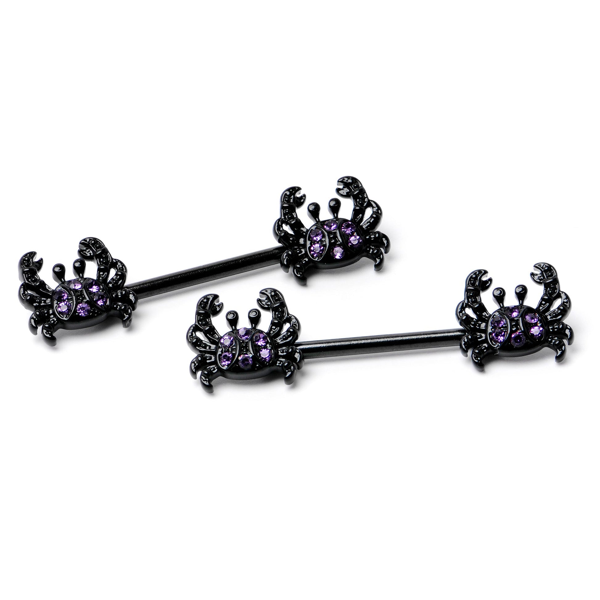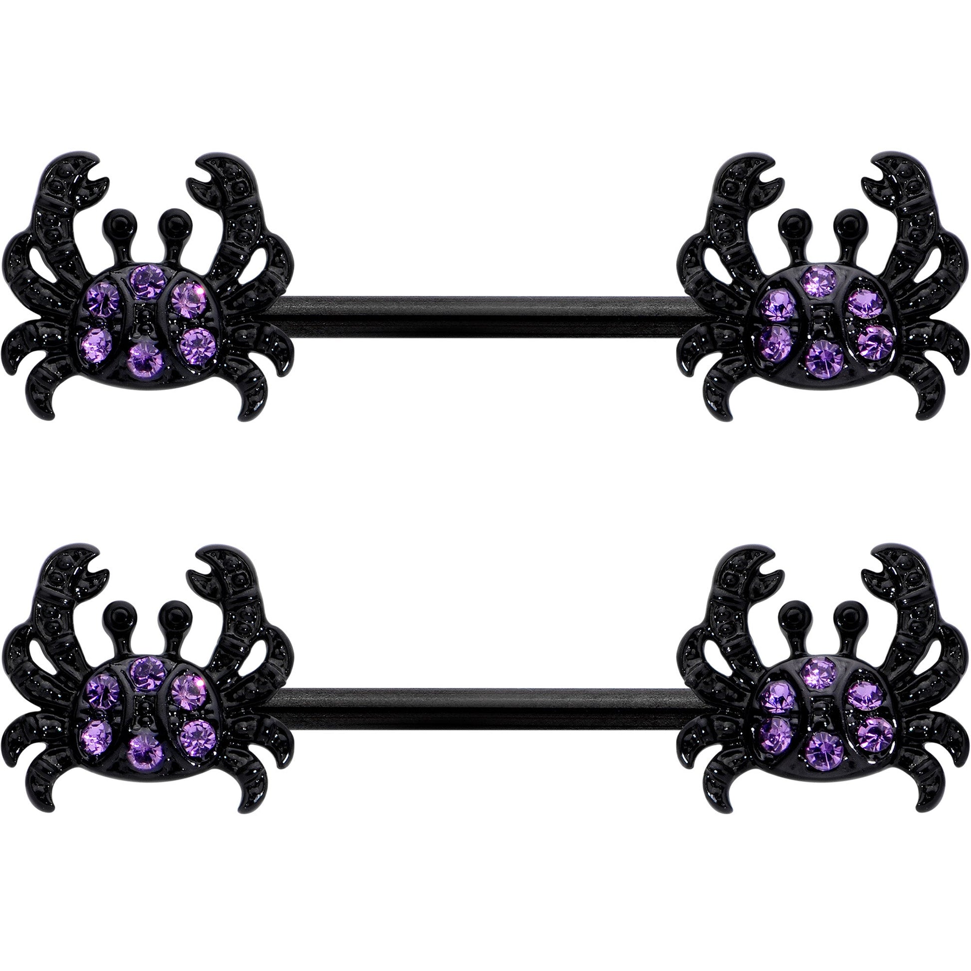 Catch a case of style when you are rocking this 14 gauge nipple jewelry. It is made with 14mm black PVD over 316L surgical grade stainless steel straight barbells. Each of the ends features a crab charm, black with purple gem embellishments. These chic crustaceans are further embellished with textured detailing for a look that is sure to please. These colorful crabby charmers make for perfectly chic nipple piercing rings. Sold as a set of two.Specifications