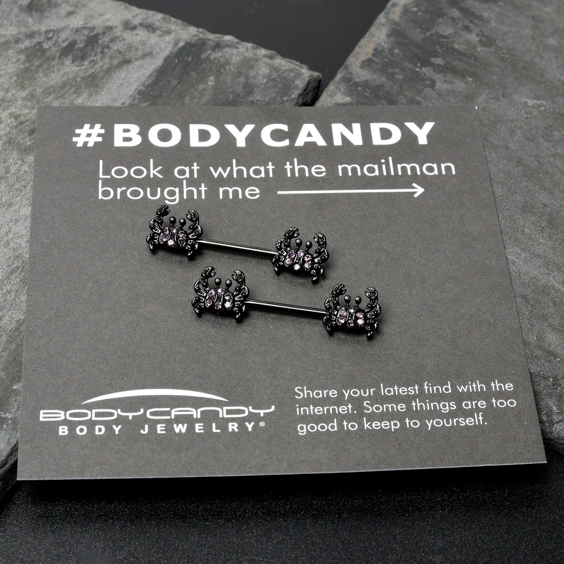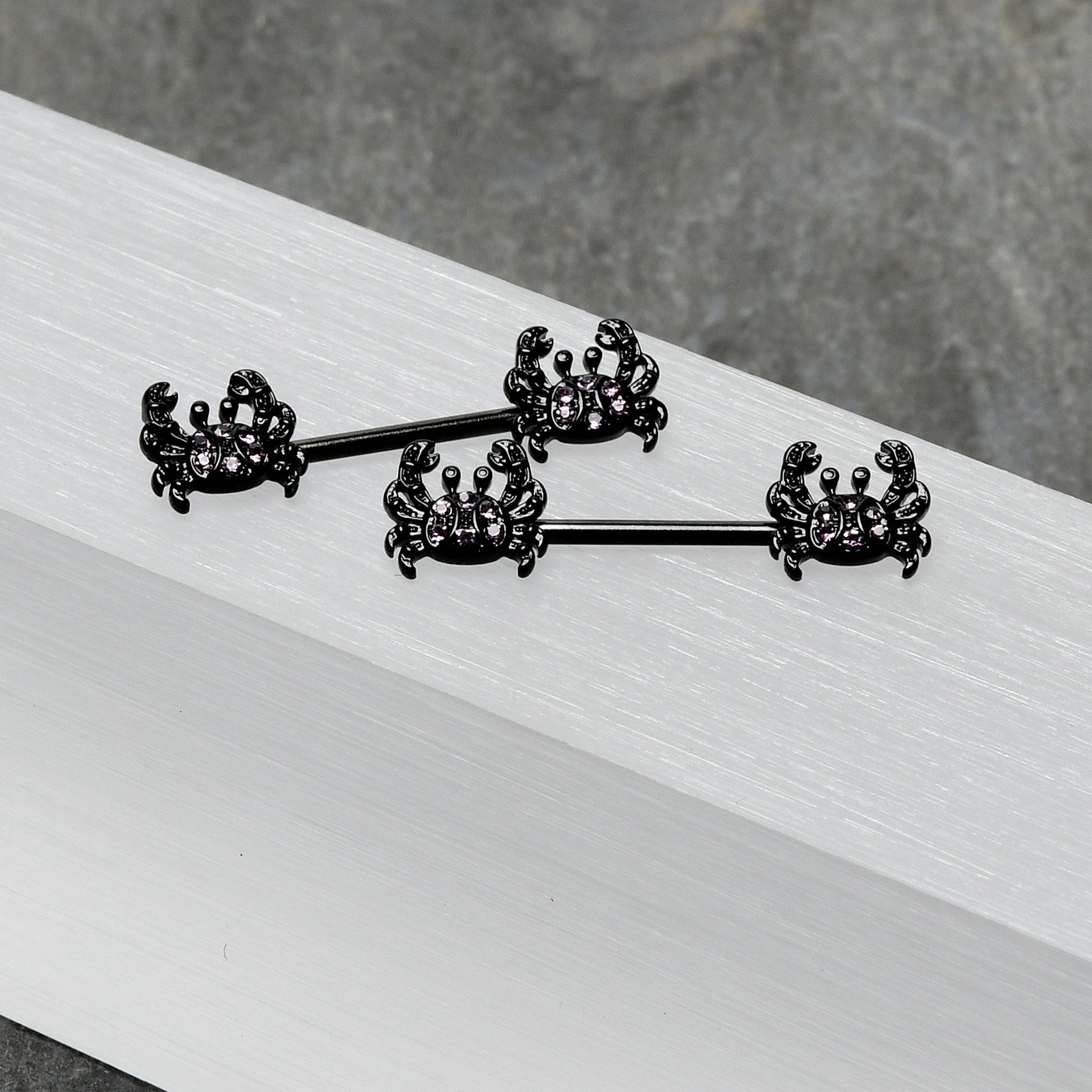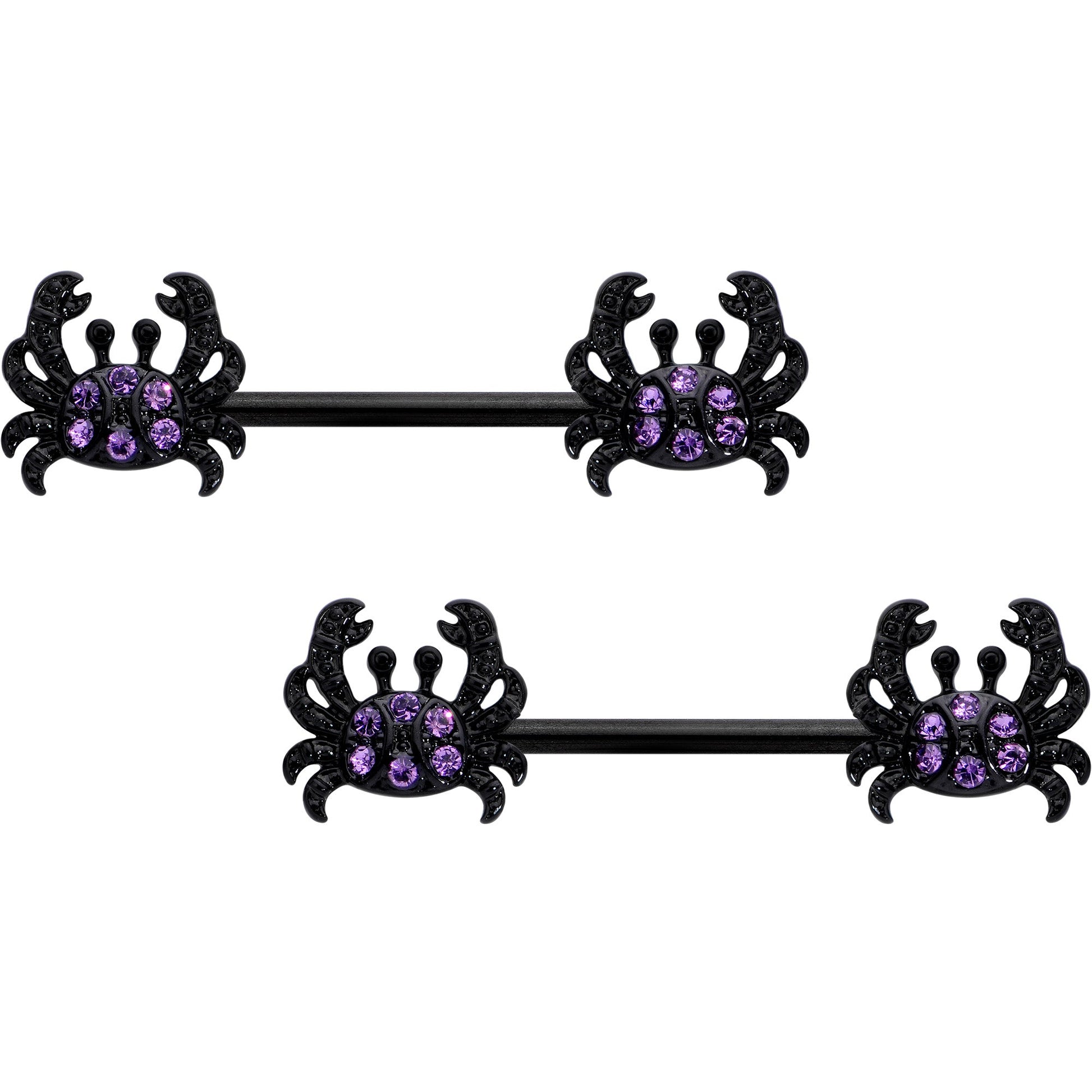 Catch a case of style when you are rocking this 14 gauge nipple jewelry. It is made with 14mm black PVD over 316L surgical grade stainless steel straight barbells. Each of the ends features a crab charm, black with purple gem embellishments. These chic crustaceans are further embellished with textured detailing for a look that is sure to please. These colorful crabby charmers make for perfectly chic nipple piercing rings. Sold as a set of two.Specifications