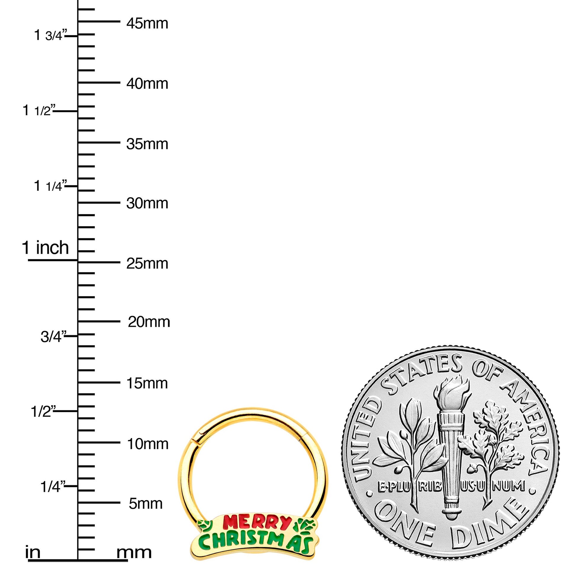 Keep the message simple with this 16 gauge septum ring! It's made with a 10mm gold tone PVD over 316L surgical grade stainless steel hinged circular ring. It features a Merry Christmas charm, with the words inlaid in festive red and green. It also features a non-removable, hinged segment that makes insertion and removal a breeze and you can rock it in multiple piercings including tragus, helix, and some daith piercings. Get your message across with this word-perfect holiday cartilage piercing ring!Specifications